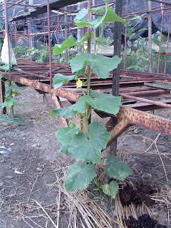 這是布布兔田園的第一條小黃瓜(很害羞地躲在花的後面),花是很漂亮的正五星