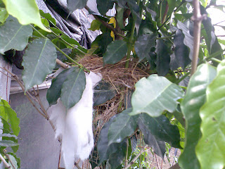 這幾天咖啡樹上來了不速之客,大約一個禮拜的時間,就從1根稻草到完整很紮實的鳥窩,好奇地把手伸進去摸了一把,空無一物,還被小兒子"訓"了一頓說::姆鳥回來發現人的味道,會不敢再回來..金正拍謝啦!請趕快回來喔!
