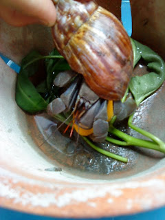 最近布布兔田園好像變成了動物園,除了白頭翁一家五口之外,二姐在他們家的菜寮抓到一隻長相奇特的勇士,乍看之下是一隻如假包換的大蝸牛,可是從裡面鑽出來的卻是一隻不折不扣的凶猛大寄居蟹,她二話不說就往這ㄦ送,小兒子看到興奮不已,馬上伸手要抓,真是說時快那時慢,那如鋼釘的利爪直接轉申反扣,扎扎實實地馬上見紅,猛啊勇啊!