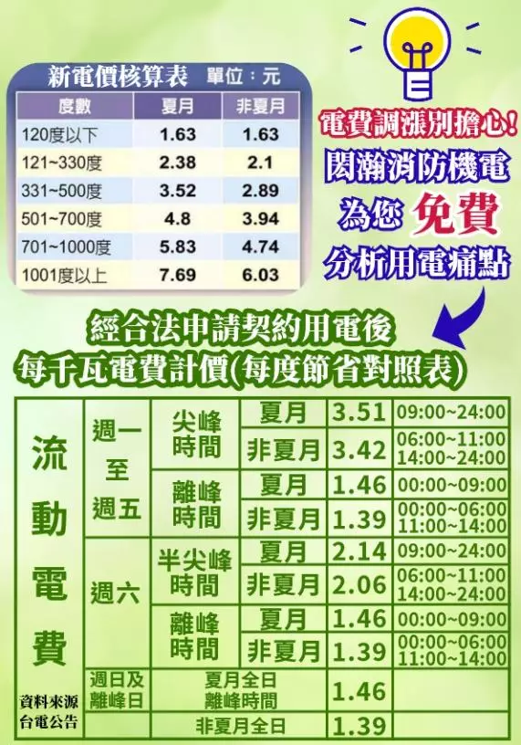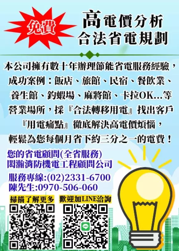 閎瀚消防機電顧問提供您專業合法的省電規劃! 本公司擁有數十年辦理節能省電服務經驗,安全為考量,選擇合法轉移用電,再行系統優化為改善,替客戶找出「用電痛點」,徹底的合法解決方案。若有違法,本公司願承擔法律責任。 免費幫您專業分析規劃營業場所用電狀況,為您申請省電節電服務,從規劃、說明至完工、前置作業完全免收服務費,一條龍服務完全合法,省錢、省能、環保。 當然!完工後您收到的電費帳單實際確認電費減少,我們才收代辦費! ●立即來電免費規劃說明,全省服務 服務專線:0970506060(同LINE ID) ●專業服務: 消防安全設備安裝施工、消防工程免費諮詢服務、工業∕空地用電配電設計施工 1.消防安全設備安裝施工 2.消防工程免費諮詢服務 3.高電價「免費」分析服務 4.工業用電配電申請設計施工 5.空地用電配電申請設計施工 手機專線:0970-506-060 LINE ID:0970506060 LINE連結:https://line.me/ti/p/9L0GvF1QXw 電子信箱:honghan0970@gmail.com 地址:基隆市七堵區八德路68號2樓 營業時間:週一到週日08:30~21:00 臉書:https://www.facebook.com/profile.php?id=100077309175752&locale=zh_TW 店家日報網址: https://buzzdaily.tw/store/pma20220314002 關鍵字查詢 台北電費節省規劃、台北省電服務、台北省電規劃、台北省電顧問、省電規劃設計、營業用電節電、高額電費解決辦法、省電方法、店面電費節省、旅館電費節省、飯店電費節省、餐飲業電費節省、釣蝦場電費節省、高電價分析服務、養生館電費節省、電費異常高昂、電力規劃、省電辦法、民宿節電、台北消防工程、台北用電申請、台北消防安全設備、台北配電工程、台北工業用電申請、電費暴增、台北空地用電申請 以上訊息由閎瀚機電節能顧問公司提供 本內容由店家日報授權,他人非經授權不許轉載、重製、公開播送或公開傳輸。[引用來源] |