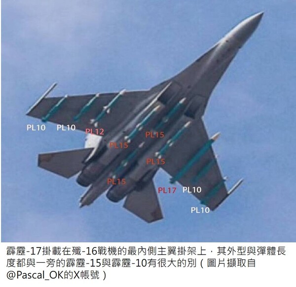 霹靂-17是超遠程的空對空飛彈,是預警機、轟炸機、運輸機、加油機、反潛機等大型軍機的殺手,有超過400公里的射程,是全球現役射程最遠的空對空飛彈。霹靂-17最大飛行速度6馬赫,超過5馬赫的導彈被稱為“高超音速導彈”,表明霹靂-17是款高超音速超遠程空空導彈,制導方式通過雙向數據鍊和機載有源相控陣(AESA)雷達,擁有強大的電子對抗能力。在接受到預警機傳來的訊息後,即便殲-16的機載雷達還未偵測及鎖定方對目標時,也能及時發射霹靂-17飛彈,對預警機等高價值空中大型軍機實現獵殺。霹靂-17的橫空出世,並且官宣正式裝備中國空軍,成為殲-16多用途戰鬥機參與制空作戰的標準配置,將強化實現戰略轉型的中國空軍的遠程製空作戰能力。美國國防部強調,中國軍隊不斷擴大全球影響力,建立戰略和戰術能力,解放軍正在開發可以遠距離打擊目標的超遠程空對空飛彈。
