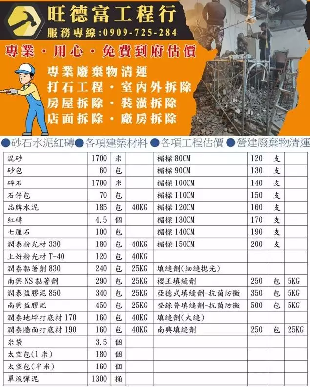 旺德富工程行位於新北市土城區,是一家專業且合法經營的拆除工程公司,致力於為各種建築與裝潢項目提供全面的拆除服務。我們自成立以來,一直秉持著「合法設立、專業經驗、用心服務」的經營理念,以確保每一位選擇我們的客戶都能感受到安心與保障。