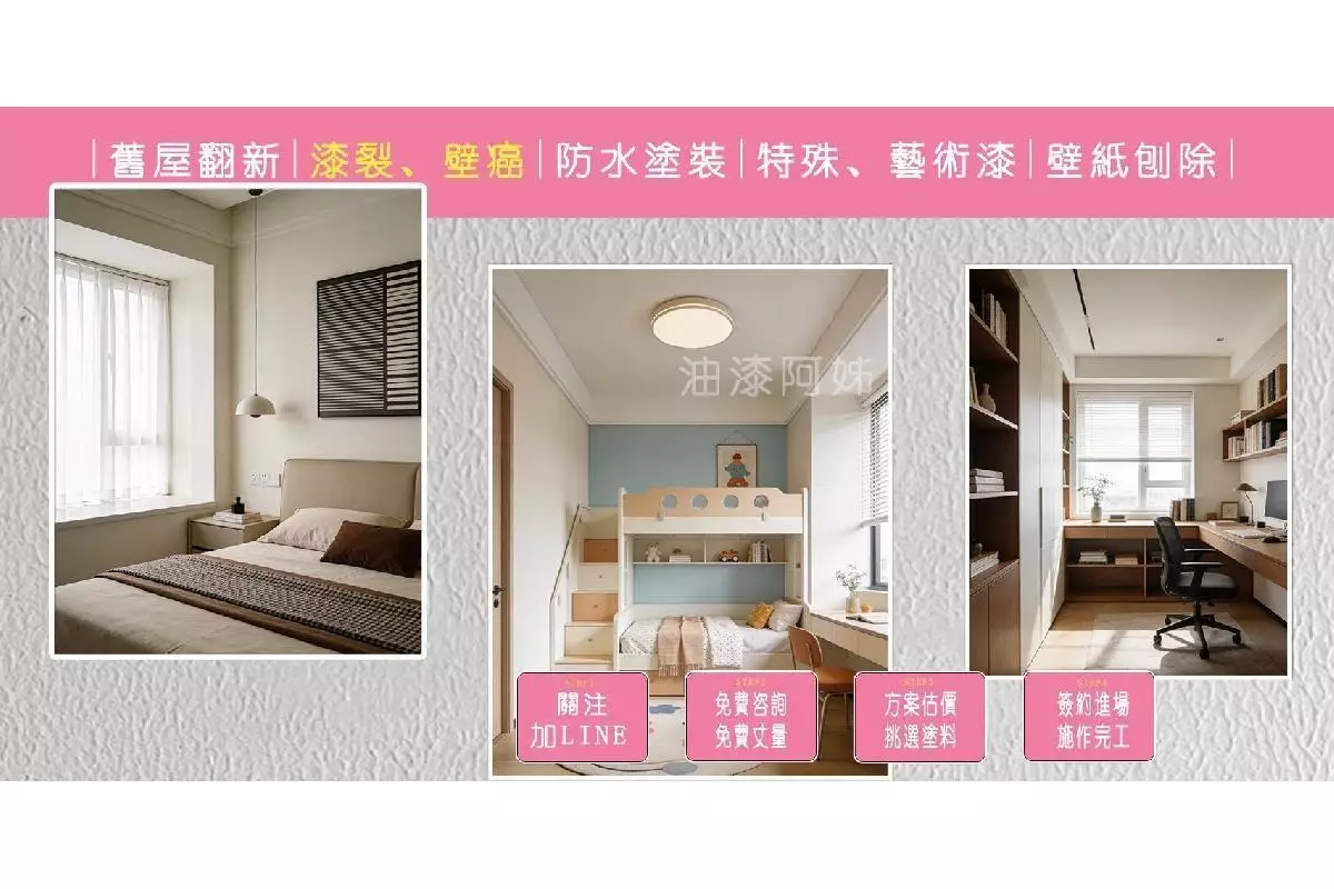 ★ 核心施工技術全面升級 油漆阿姊持續引進新式工法與材料,打造更高品質的翻新服務: - 內外牆超持妝噴塗:色澤均勻、防潑水、抗紫外線 - 建築變色龍技術:72小時完成全屋改色,大幅縮短工期 - 太空級隔熱塗層:降溫約5℃,節電約30% - 壁癌根除手術:德國結晶防水工法,從源頭處理滲水並提供保固 - 微創拆除工程:降低震動與粉塵,保護原有結構 - 奈米級深度清潔:完工同步清潔,交屋即可入住 ★ 一站式整合服務,翻新無煩惱 油漆阿姊提供完整整合服務: 油漆工程∣防水工程∣壁癌處理∣裝修拆除∣房屋清潔 同時整合環氧樹脂地坪、木地板與塑膠地板鋪設、鐵工工程、廚具施工、燈具與冷氣安裝、綠化工程、壁紙貼附、瓷磚貼鋪與廢棄物處理,真正做到「一通電話,全案搞定」。