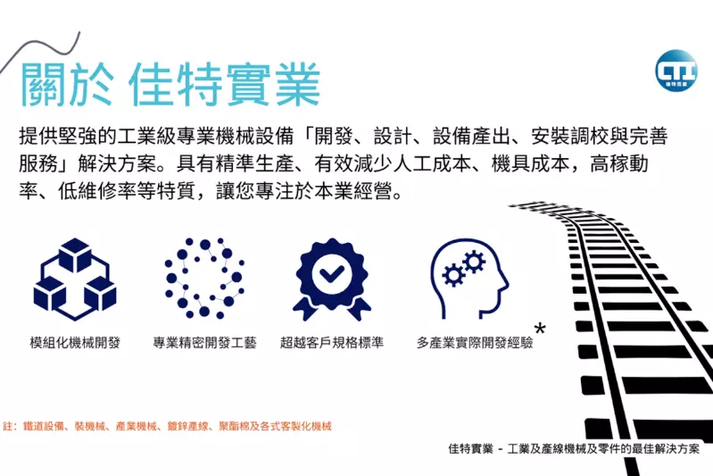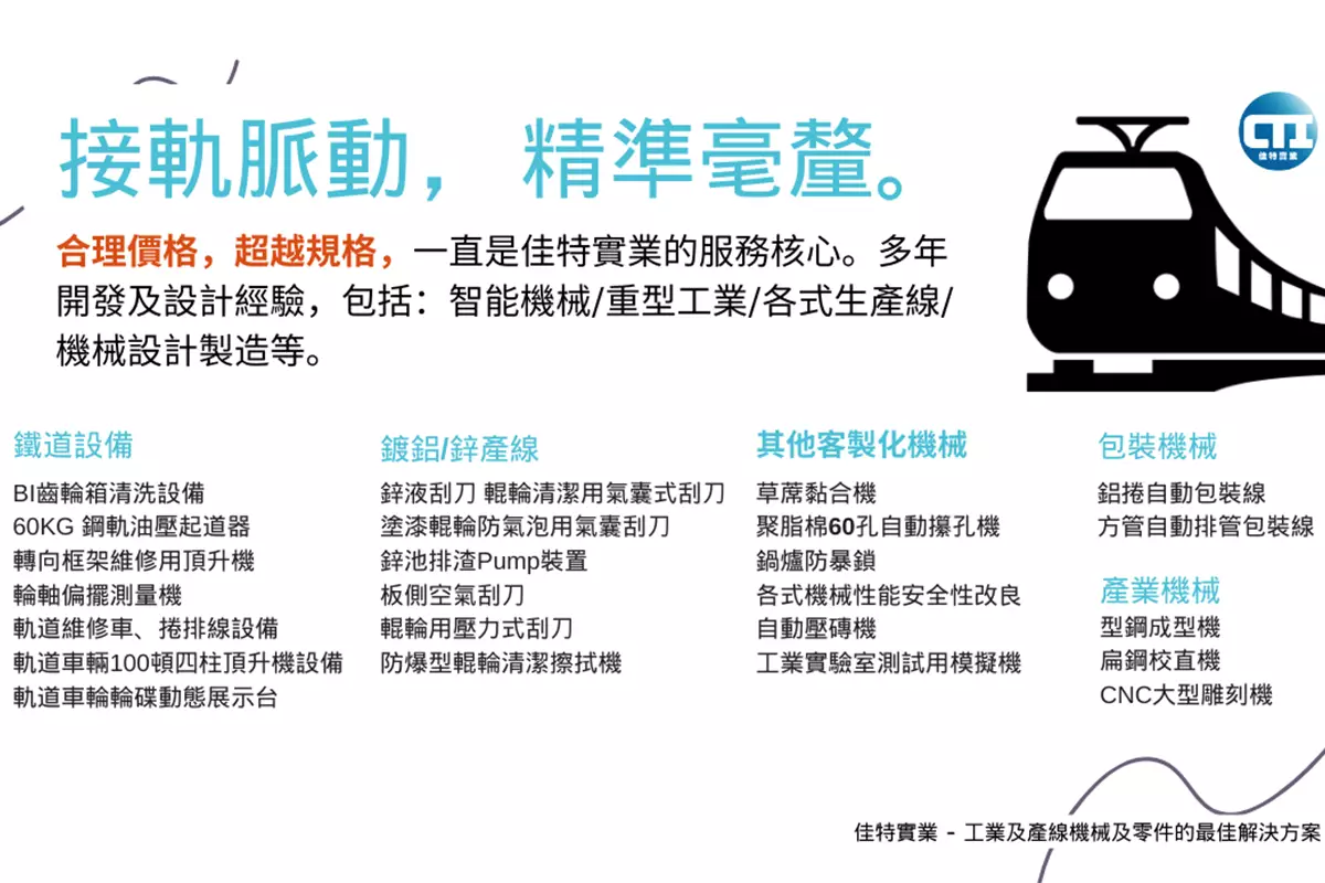四大設備領域 精密工業的強大後盾 佳特實業的產品涵蓋包裝機械、產業機械、鐵道設備、鍍鋅生產線四大核心領域,並能依需求開發其他客製化設備。 △ 產業機械 包括型鋼成型機、扁鋼校直機、CNC大型雕刻機等,廣泛應用於鋼鐵、金屬加工與建材產業。這些設備以高剛性結構與精準控制著稱,能確保長時間運行下仍維持穩定效能。 △ 鐵道設備 佳特實業擁有完整的鐵道維修與測試設備生產能力,軌道維修車、100噸級頂昇機、BI齒輪箱清洗設備、60KG鋼軌油壓道器、轉向框架維修用頂升機、軌道車輪輪碟動態展示台等,協助鐵道系統提升維修效率與安全性。 △ 鍍鋁/鋅產線 提供鋅液乱刀、氣囊式刮刀、鋼捲解捲與塗油設備、鋅液廢渣夾具、排渣Pump裝置等模組化解決方案,協助客戶優化鍍層品質與減少原料耗損。