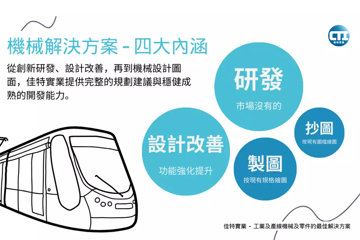以精密工藝為核心,打造智慧製造新價值 佳特實業多年來深耕精密機械設計與製造領域,專注於客製化工業機械與模組化產線設備的研發生產。公司秉持「專業、創新、品質、服務」的經營理念,從設計開發、設備生產、安裝調校到售後維護,提供一站式整合服務,讓客戶無後顧之憂。 「我們從事工業機械設計已有多年的經驗,這使得我們能夠為客戶的需求提供最佳的解決方案。不論是客戶提供設計概念,還是由我們從零開始討論,我們都會從實際運作、效能、成本與維護面全盤分析,確保計畫能以最高效方式落實。」 佳特實業擁有專業的技術團隊,透過嚴謹的生產流程控管,提供高精度、高穩定性的設備,並協助客戶提升生產效率與降低能耗。從產線自動化到智慧控制系統整合,佳特實業在每一個細節中都展現出工業製造的深厚底蘊。 全方位服務 從研發到產線佈局的完整支援 佳特實業的服務涵蓋了工業設備生命週期的每個階段,包括: - 研發與創新:針對市場上尚未出現的特殊需求,開發專屬設備。 - 設計與改善:針對現有機械設備進行性能升級與結構優化。 - 製圖與抄圖:提供高精度製圖支援,協助客戶建立完整設計資料。 - 設備製造與安裝:從零件製作到整機組裝、現場調校一貫化作業。 - 維修與顧問服務:提供長期維護與營運優化諮詢,確保設備穩定高效。
