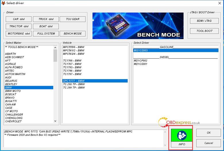 方法二:在Select Driver界面中,選擇運行模式、汽車製造商、車輛和司機,然後點擊屏幕右下角的“INFO”,查看對應的接線圖。