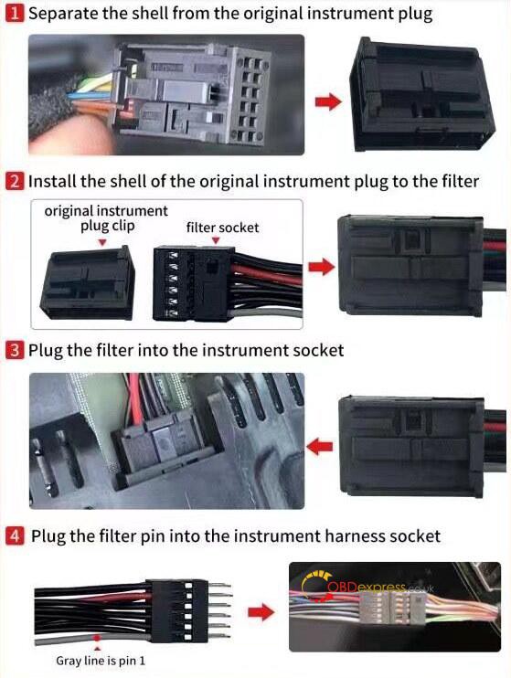 詳細步驟: 1.將外殼與原儀器插頭分離 2.將外殼安裝到過濾器上 3.將過濾器插入儀器插座 4.將過濾針插入儀表線束插座