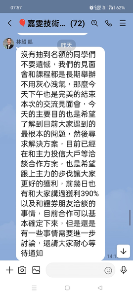 股票詐騙群族還真盛行,每天看他們自導自演,手法開始先介紹讓你信投資名人(大頭照)加入line後轉美助又轉到詐騙大群族,剛開始會介紹賺錢飆股,什麼奇怪的都有還真能賺些,之後搞什抽獎煞有其事的搞密會,連拍好的影片都很齊全,準備大收割,才短短一個月就著急收割了!