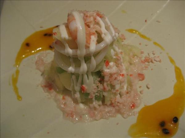 ﹝香蘋鴨胸沙拉﹞ 我們兩人都點不一樣的菜色,「五花八門」或「目不暇接」適足以形容。首先是海鮮水果沙拉和香蘋鴨胸沙拉,海鮮水果沙拉主要是香瓜、馬鈴薯泥,上置蝦仁一隻,澆淋白沙拉醬,外圍則有黃色百香果醬,堪稱色香味俱全。 香蘋鴨胸沙拉,賣點是中間的薄片鴨胸肉,四周由花朵般的蘋果薄片所圍繞,創意十足,最底下是生菜鋪底,配一顆紅豔小蕃茄,相當美觀。食用時,淋上以油醋為基底的蘸汁。此道菜餚雖散發蘋果香,惜薄片鴨胸肉本身都被其他味道壓蓋過去了。