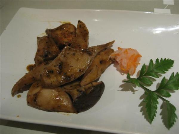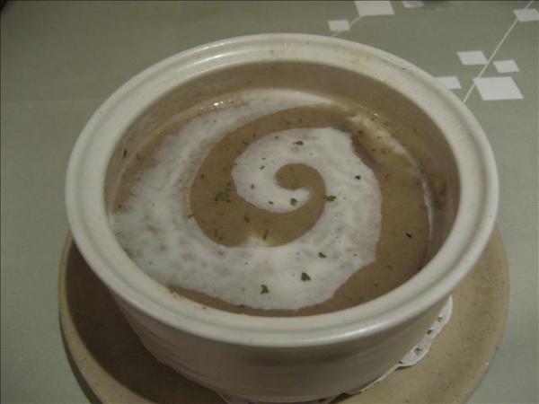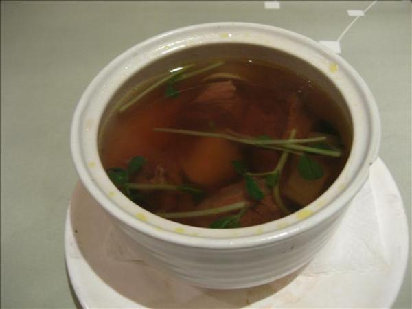 ﹝烤杏鮑菇﹞ 前菜是烤杏鮑菇,看不出是炒或烤?然上菜時,熱騰騰的,直冒熱氣,頗能引起食慾。杏鮑菇切塊,尚軟嫩,搭配醃漬過的蘿蔔絲食用,口感不錯。 湯品是白蕈野菇濃湯和百合牛腩湯,白蕈野菇濃湯的野菇味濃郁,百合牛腩湯的片片百合相當清新,牛腩難得鮮甜,且二者皆燙口,湯頭亦佳,超乎預料,其水準值得嘉許。