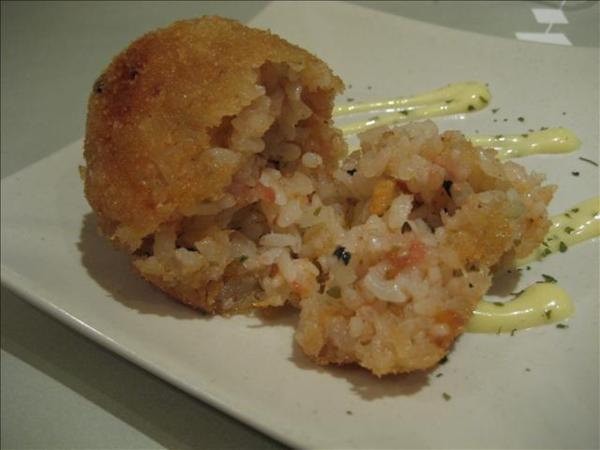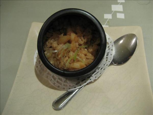 ﹝百合牛腩湯﹞ 再者是鮭魚炸飯糰和蟹之御飯糰,鮭魚炸飯糰是揉成球狀,外表酥炸的口感,嚐起來像鍋巴,沾著鋪底的黃芥茉醬一起食用,很特別,然油膩了些。蟹之御飯糰則裝填在開口小甕,米飯調味炒過,醬味重,蟹肉味道嫌淡。吃過飯糰,主菜登場之前,服務生奉上桑椹醋汁,酸酸甜甜冰冰涼涼,先去除油膩,而且可以續杯,誠為店家體貼的安排,令顧客感到窩心。