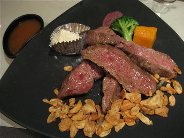 ﹝桑椹醋汁﹞ 主餐是香蒜瓦片牛肉和陶板海陸。香蒜瓦片牛肉六分熟,蘸黑胡椒、紅酒為基底調製的醬汁。四長條牛肉,份量不少,牛肉微紅柔嫩,流出鮮甜的肉汁,在口中咀嚼時,逐漸散發牛肉本身的香味。配菜有花椰菜、醃梨片、蕃薯塊、香蒜片等,蕃薯塊甜而可口,香蒜片數量頗多,可惜上桌時已失去脆度,誠美中不足也。