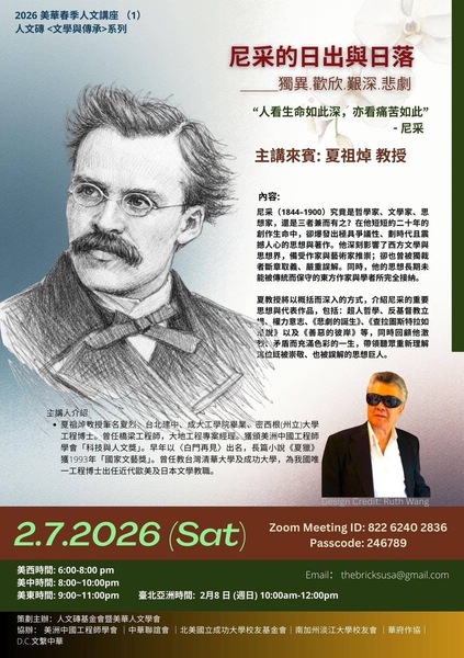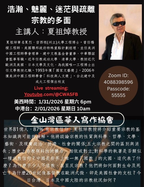 日期: 二月 7日 週六 晚6:00 - 8:00 PM(美西時間) 亞洲台港星馬2月8日 週日晨10:00-12:00 Zoom Meeting ID: 822 6240 2836 Passcode: 246789