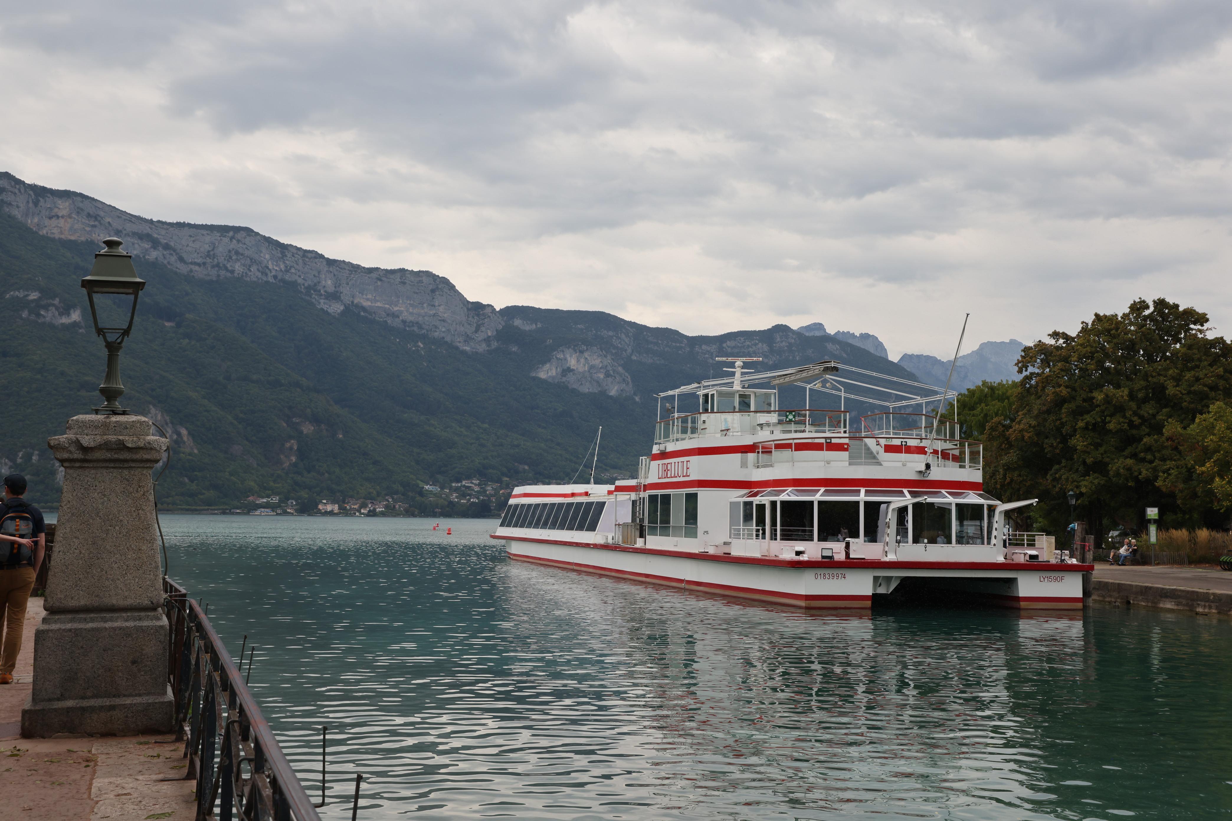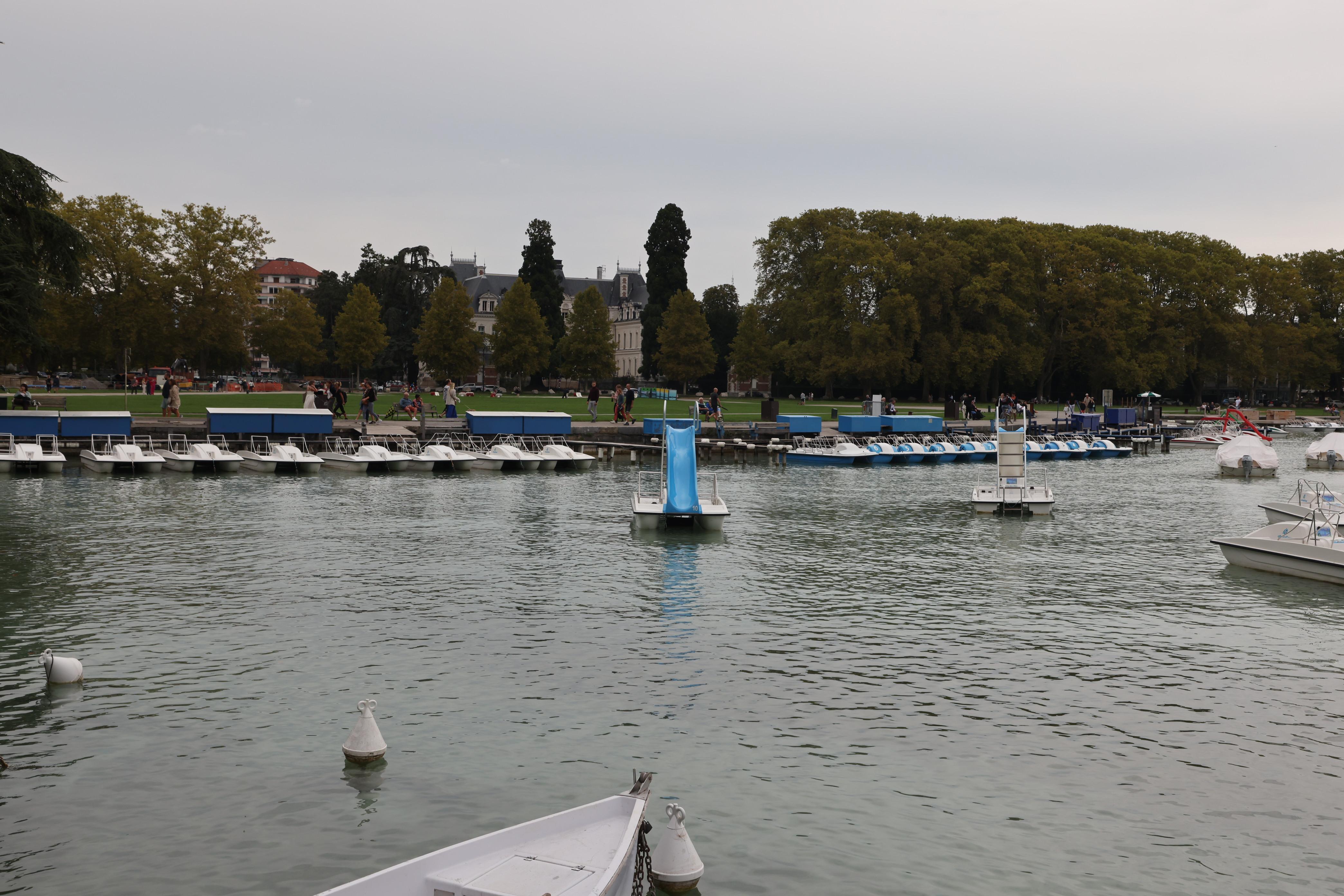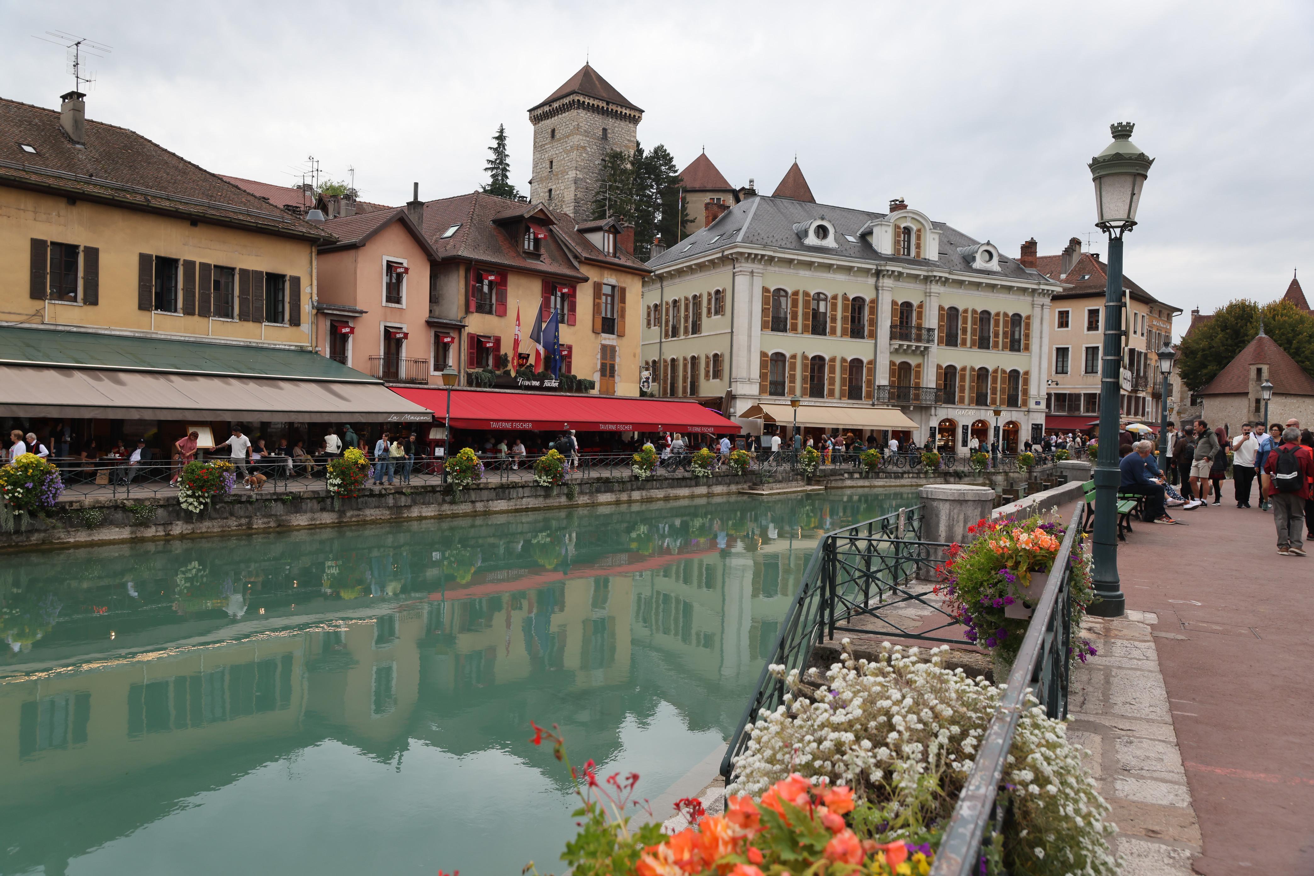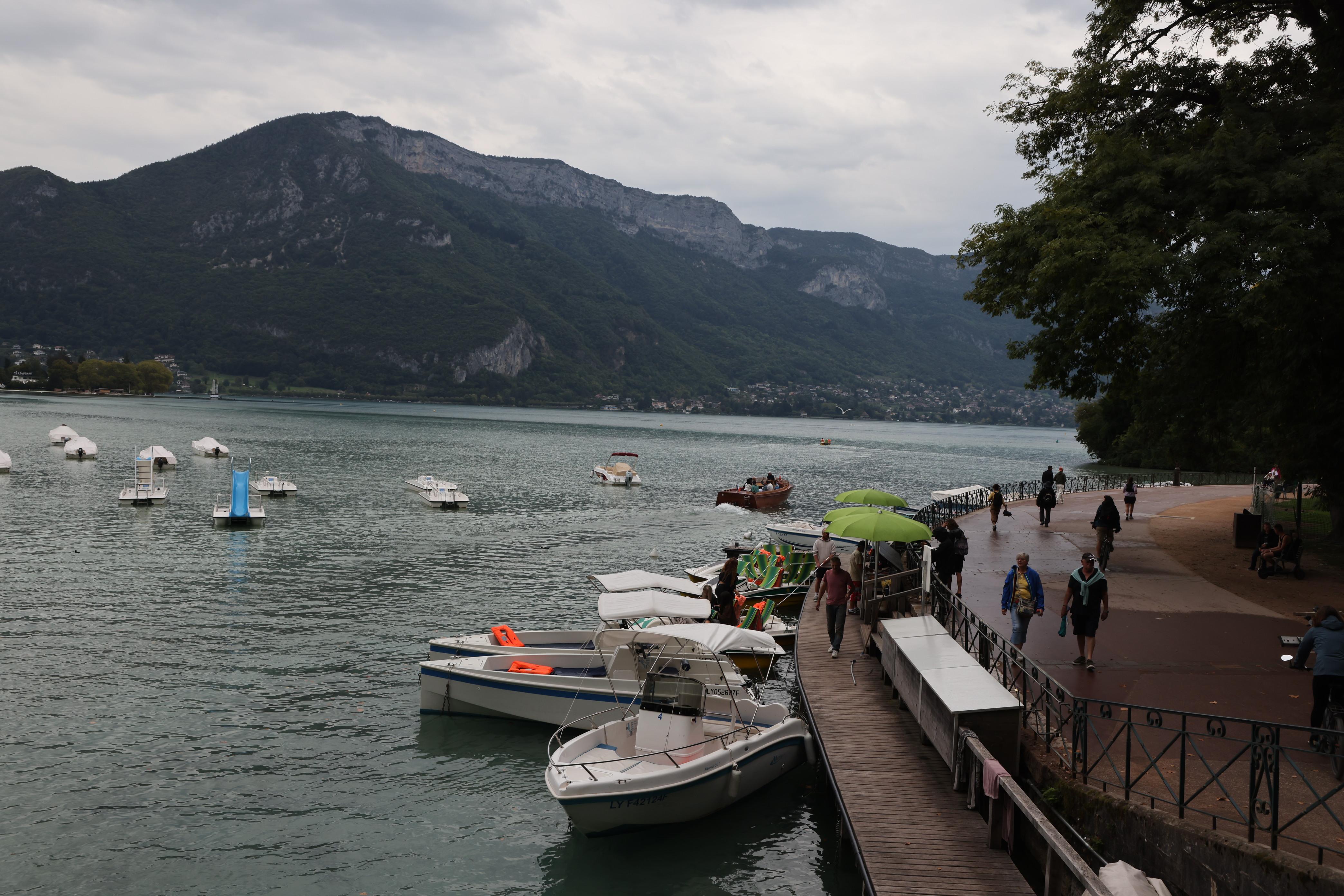 再走過湖畔的歐洲花園,園中楓樹的早鳥,葉子已呈金黃,秋意漸濃,沿著蒂烏河岸,走到原是舊城中心中的碼頭,成排建築儼然,色彩豐富,河中小島似船型的島嶼宮(Palais de lIsle)矗立,河水靜靜流轉,如一面微晃的鏡子,將對岸中古世紀建築與雕花窗影細細收納,倒映出層層疊疊的光影與歲月。石欄之上繁花盛放,奼紫嫣紅,為沉靜水色添上一抹明亮。河畔人聲輕語,遊客往來如織,身影亦隨波蕩漾,與建築一同倒映水中。此刻的安錫,於真實與倒影之間,緩緩展開一幅流動而溫柔的圖畫。 ▲▼▼安錫湖遠眺數景。安錫湖被譽為歐洲最清澈湖水,以帶著綠的淡藍色,像土耳其藍(Turquoise),也向蒂芬尼藍(Tiffany Blue)的夢幻水色著稱,此刻褪去了寶石的光澤,在多雲微雨的天色下,泛著一種溫潤而內斂的灰藍。