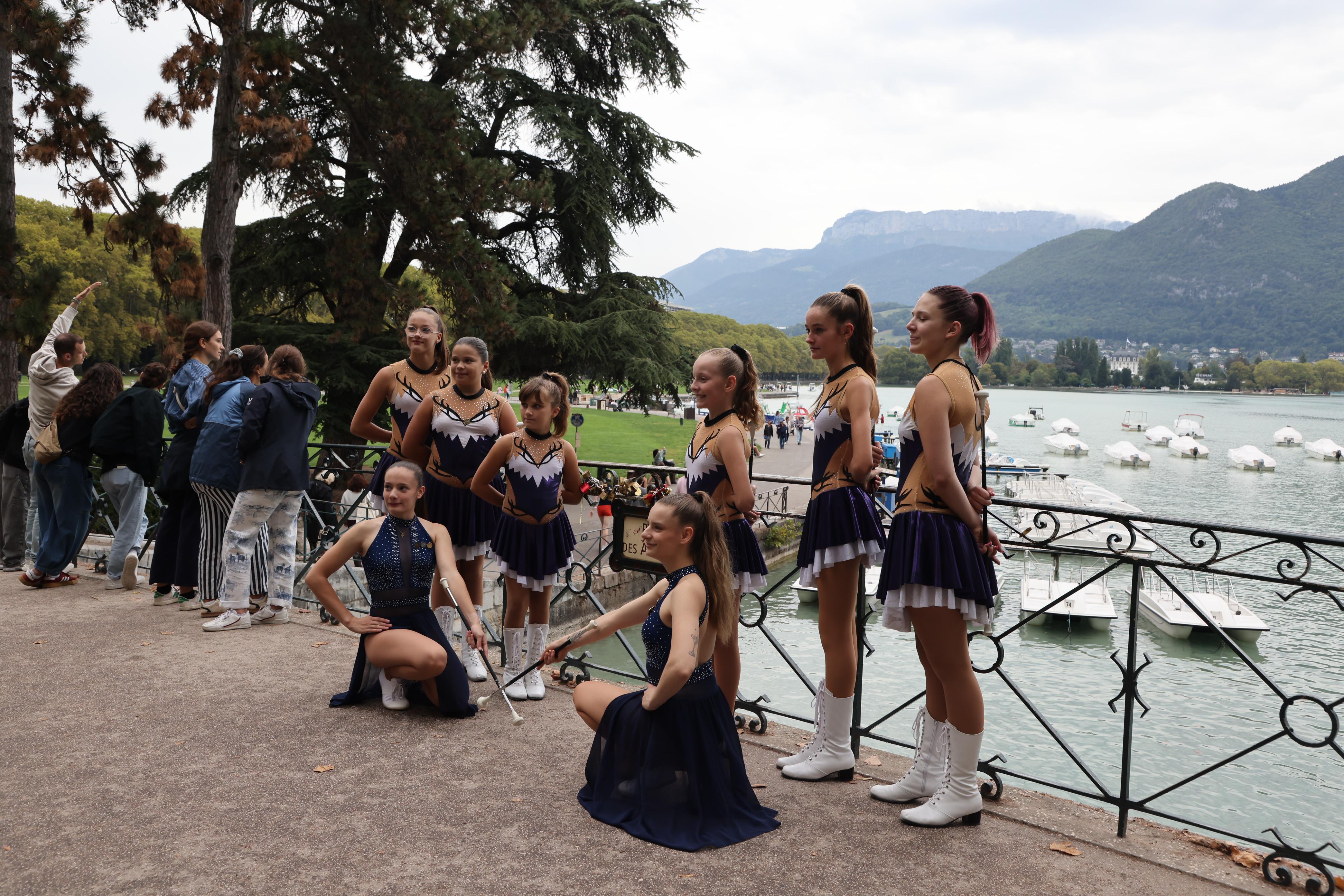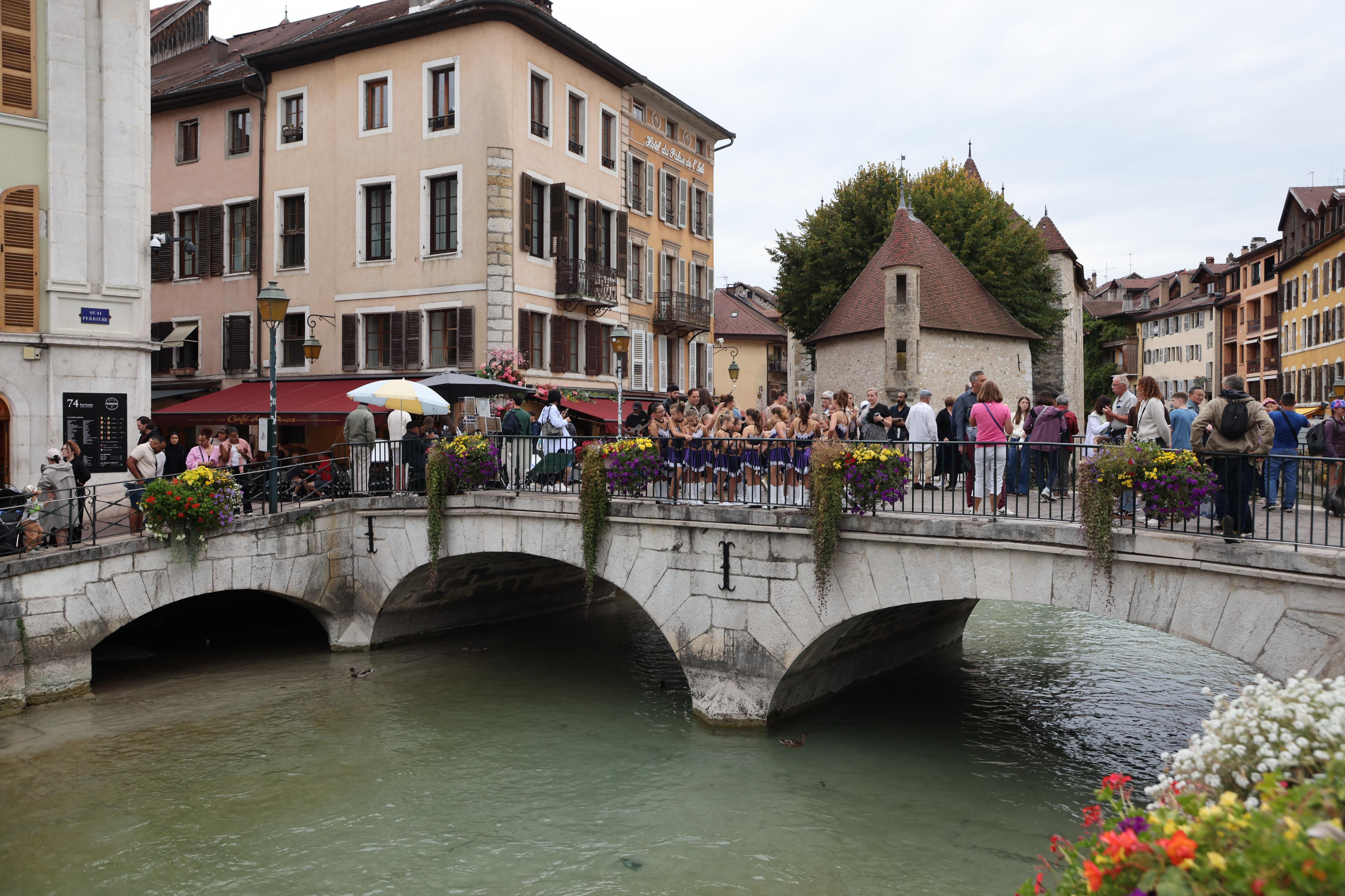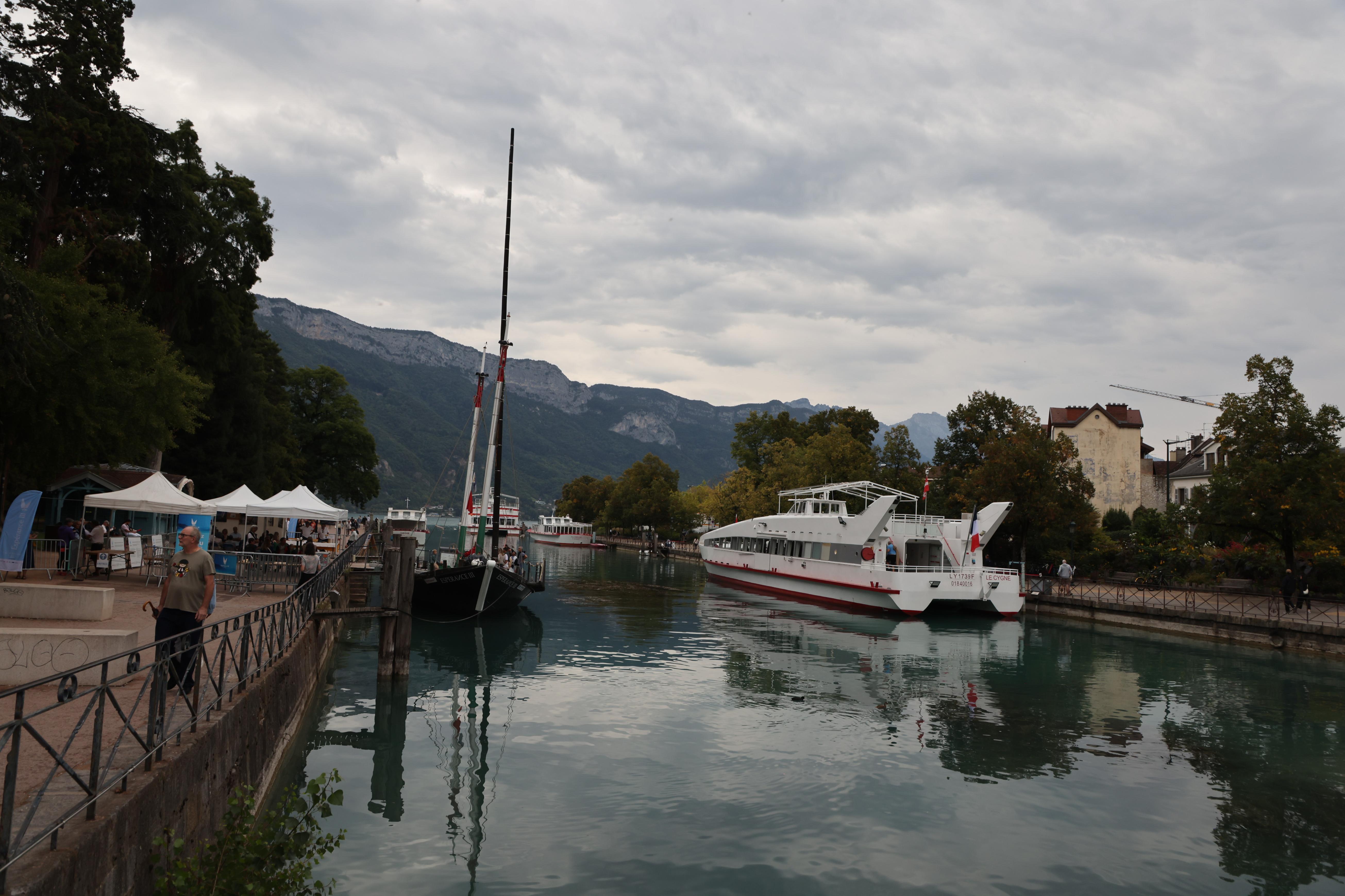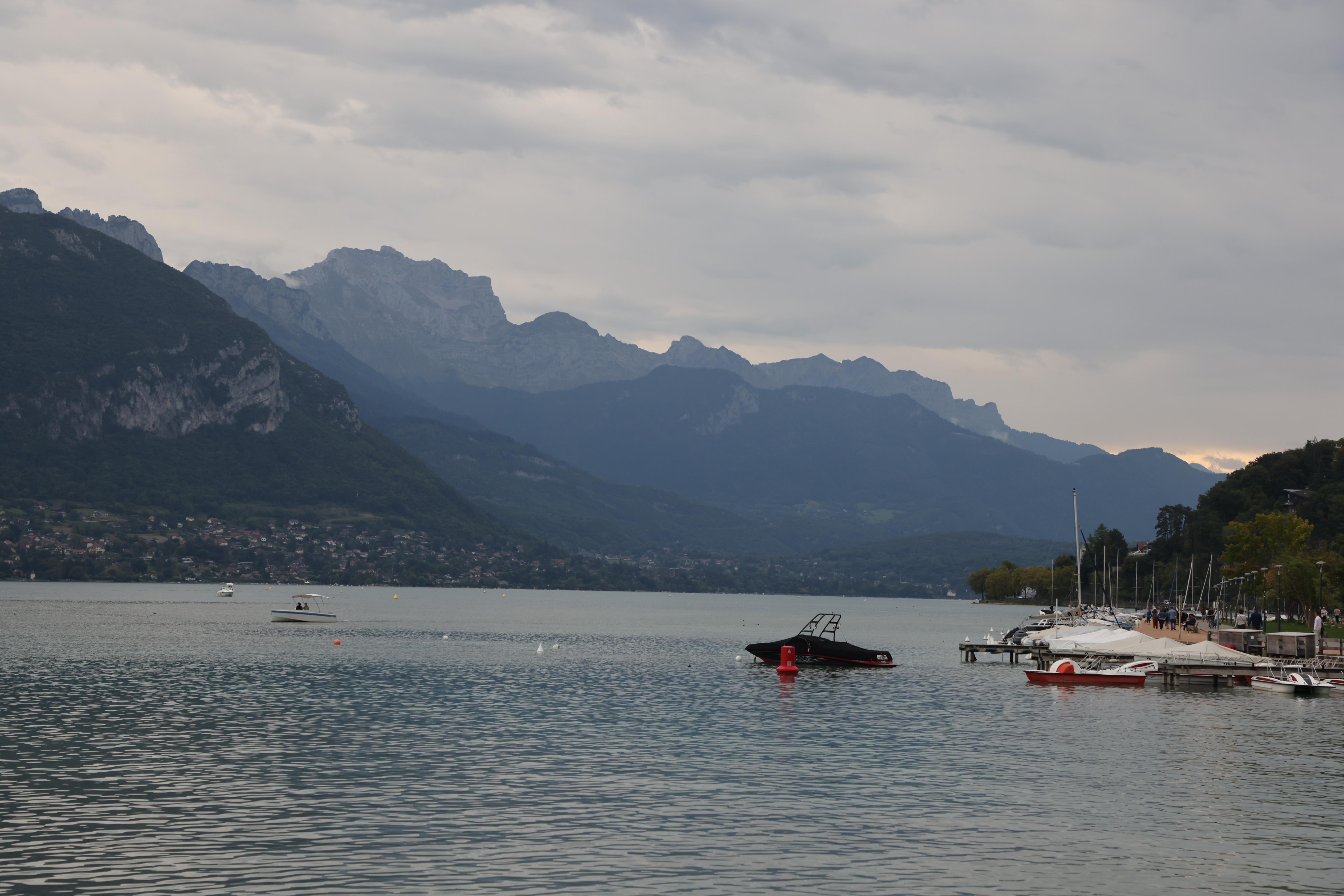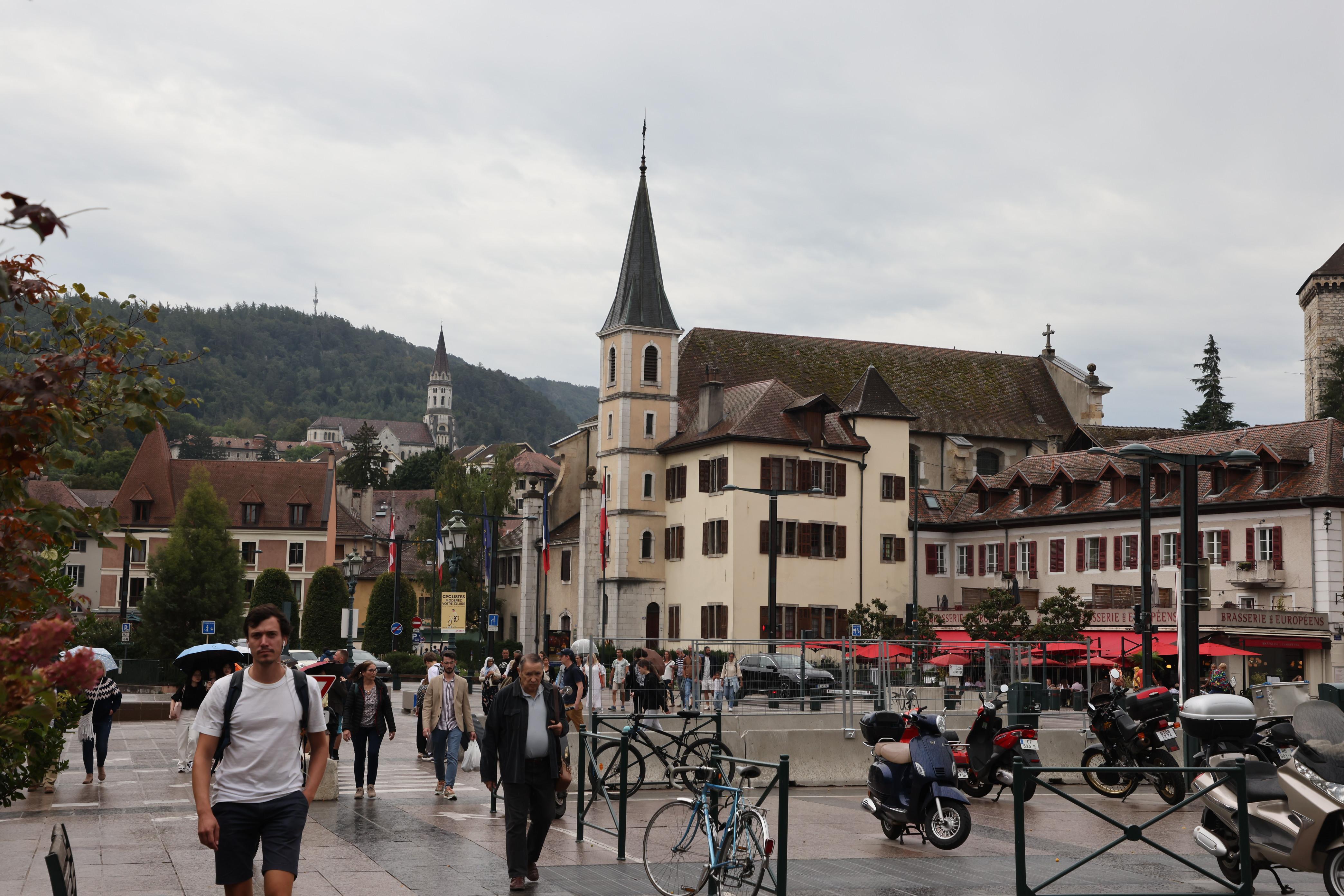 再走過湖畔的歐洲花園,園中楓樹的早鳥,葉子已呈金黃,秋意漸濃,沿著蒂烏河岸,走到原是舊城中心中的碼頭,成排建築儼然,色彩豐富,河中小島似船型的島嶼宮(Palais de lIsle)矗立,河水靜靜流轉,如一面微晃的鏡子,將對岸中古世紀建築與雕花窗影細細收納,倒映出層層疊疊的光影與歲月。石欄之上繁花盛放,奼紫嫣紅,為沉靜水色添上一抹明亮。河畔人聲輕語,遊客往來如織,身影亦隨波蕩漾,與建築一同倒映水中。此刻的安錫,於真實與倒影之間,緩緩展開一幅流動而溫柔的圖畫。 ▲▼▼安錫湖遠眺數景。安錫湖被譽為歐洲最清澈湖水,以帶著綠的淡藍色,像土耳其藍(Turquoise),也向蒂芬尼藍(Tiffany Blue)的夢幻水色著稱,此刻褪去了寶石的光澤,在多雲微雨的天色下,泛著一種溫潤而內斂的灰藍。