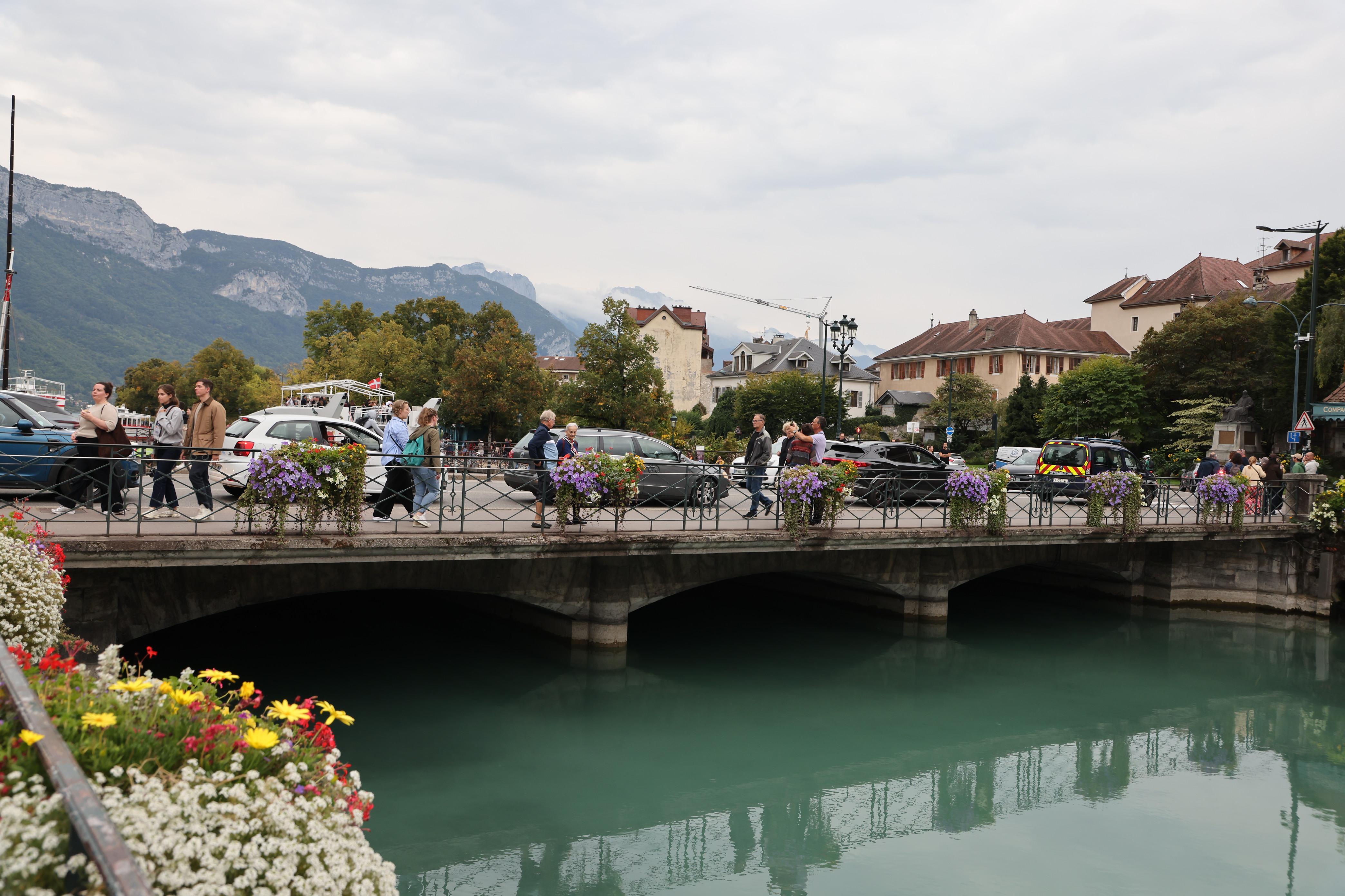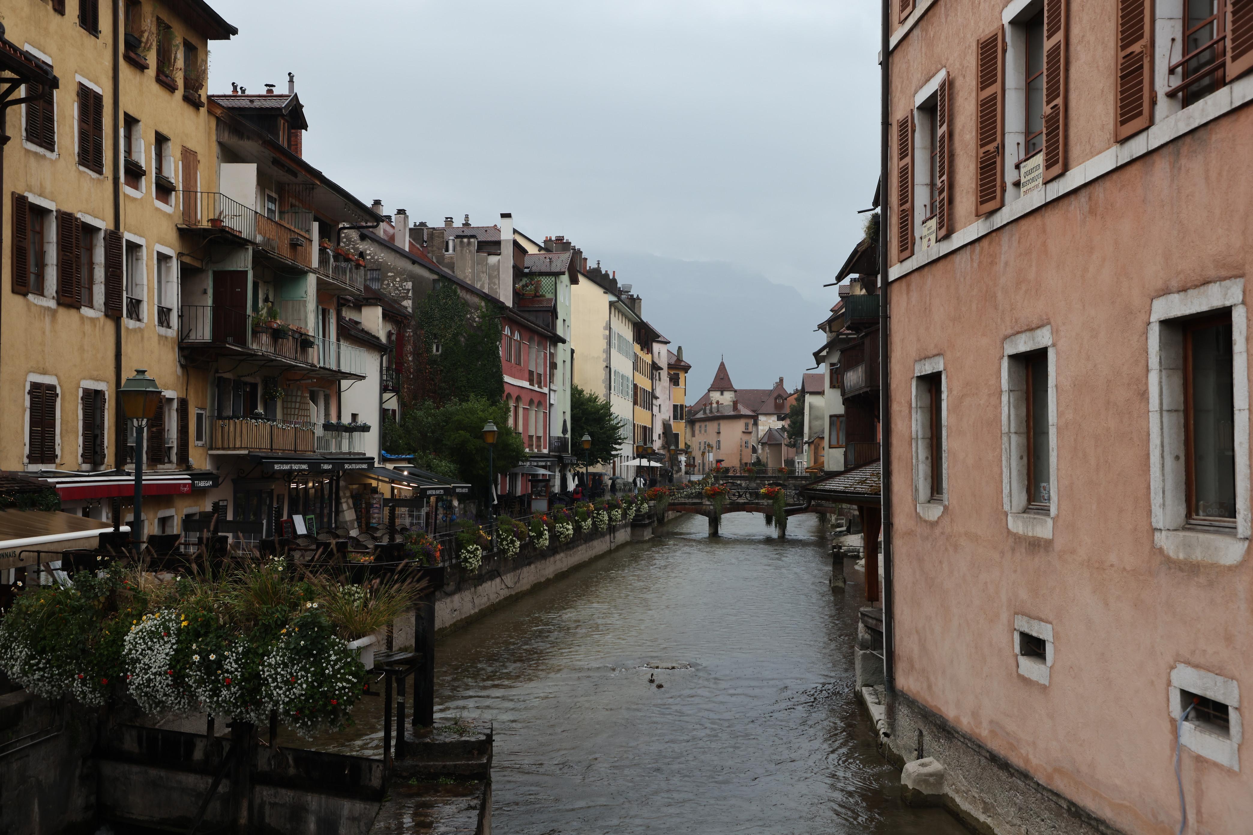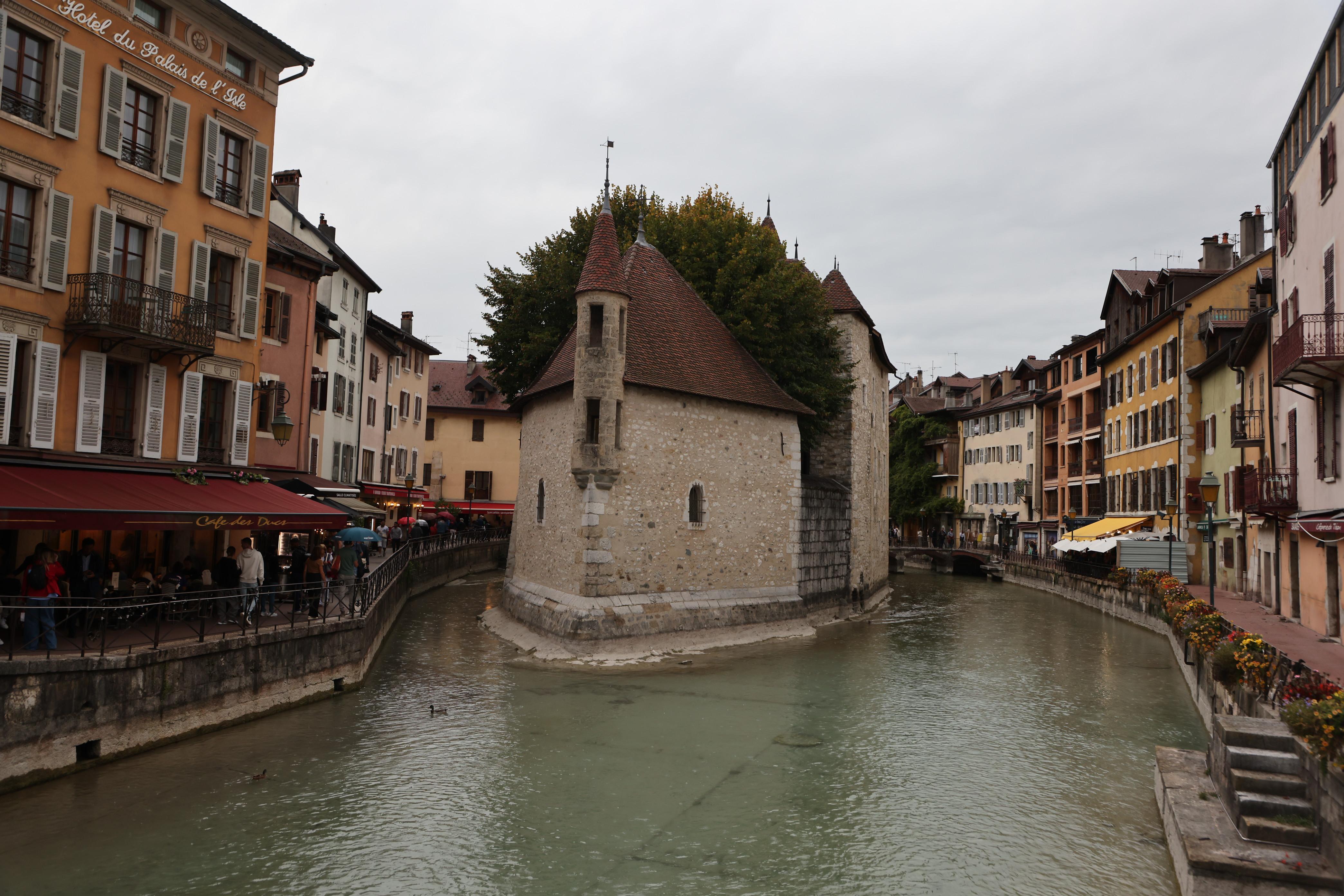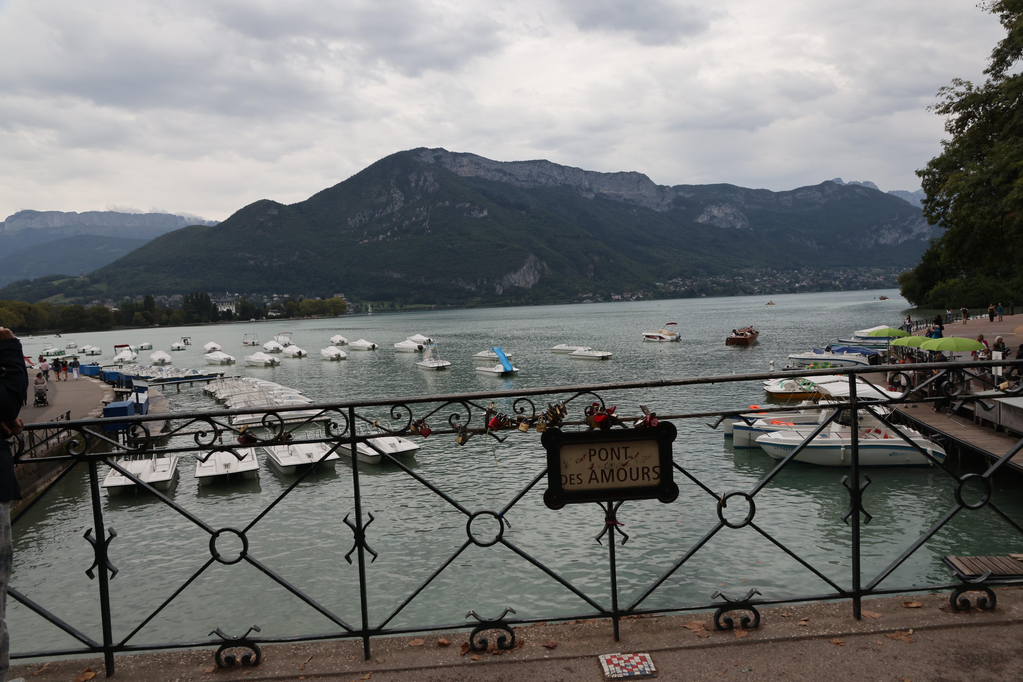 之一 遠岫迤邐接碧霄,煙波萬頃映輕搖, 孤帆數點浮光外,人立湖津聽晚濤。 之二 山色朦朧水色寒,數聲柔櫓過前灘, 晚來收盡瀟湘雨,惟見湖心月半彎。 之三 蒂烏河畔錦玲瓏,奼紫嫣紅煙映空, 穿梭人潮如織錦,尋芳共在畫圖中。 之四 翡翠波光漾翠微,石船孤峙影依迴, 千年古堡河中立,疑是仙蹤入夢飛。 在安錫吃過午餐,微雨中來到安錫湖,走過遍植法國梧桐的瓦瑟運河(Canal du Vasse),再經愛之橋(Pont des Amours),遠眺湖心,雲影沉沉地壓在阿爾卑斯山的山頭,偶而還飄點雨絲,遠方石灰岩山脈迤邐出一道淡青色的墨痕,沒入氤氳的湖光山色中。這被譽為歐洲最清澈湖水,以帶著綠的淡藍色,像土耳其藍(Turquoise),也像蒂芬尼藍(Tiffany Blue)的夢幻水色著稱,此刻褪去了寶石的光澤,在多雲微雨的天色下,泛著一種溫潤而內斂的灰藍。煙波浩渺間,幾抹輕盈的船影如斷章的詩句,隨意點綴在靜謐的湖面。空氣中滲透著微涼的濕意,細雨偶爾在水面勾勒出漣漪,又悄然散去。這份冷調的詩意,天地悄然,唯有遠山與湖水在霧氣中交疊,編織出一場不願醒來的法式初秋之夢。