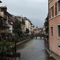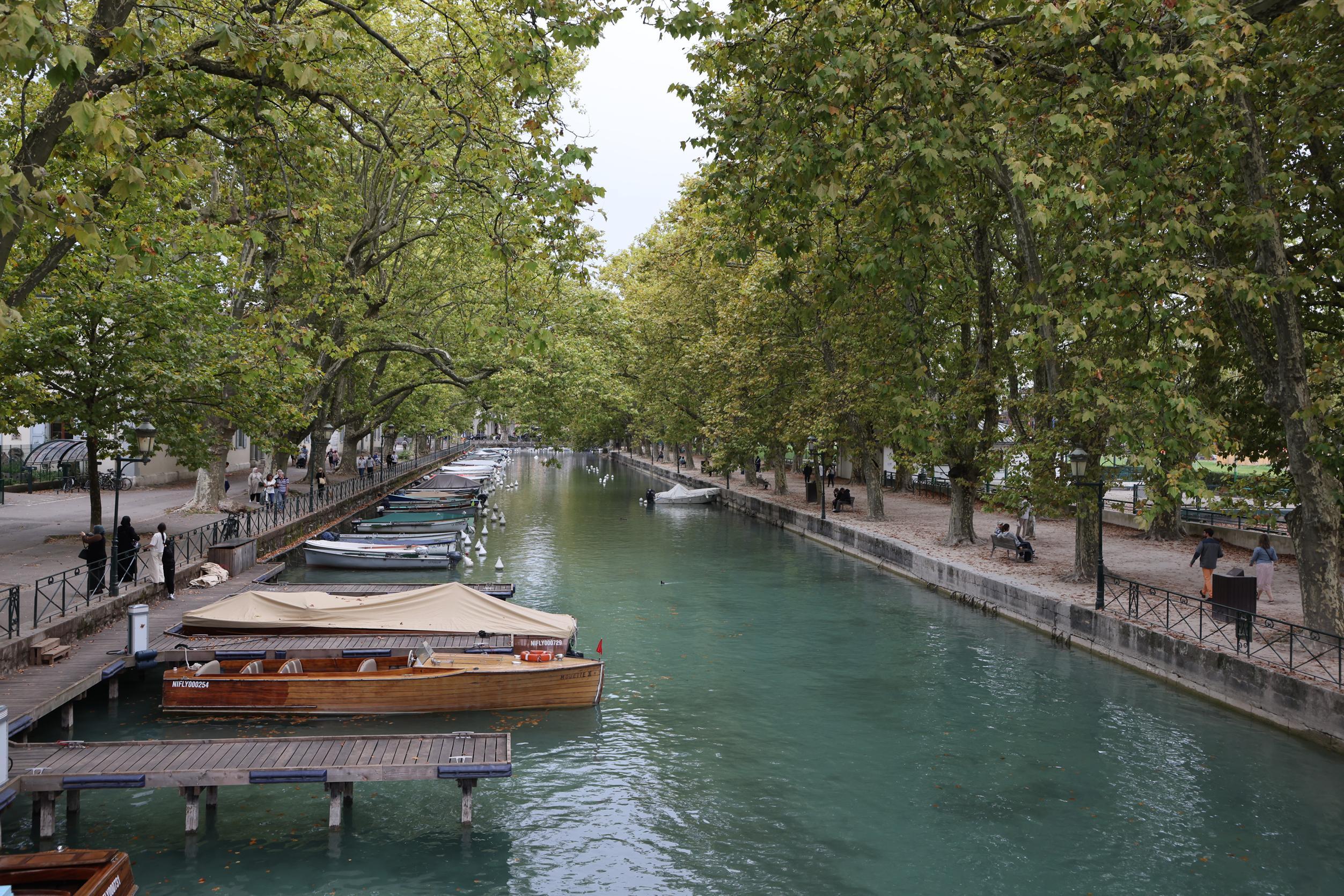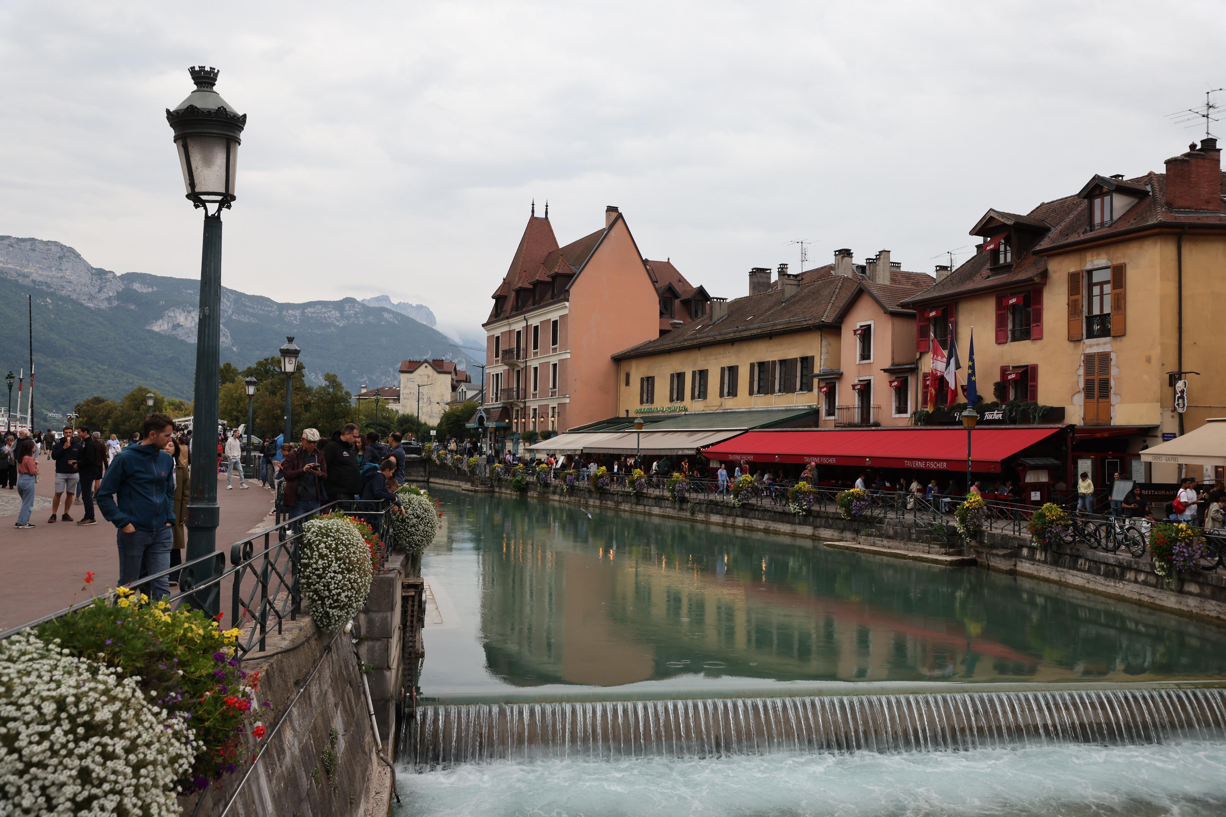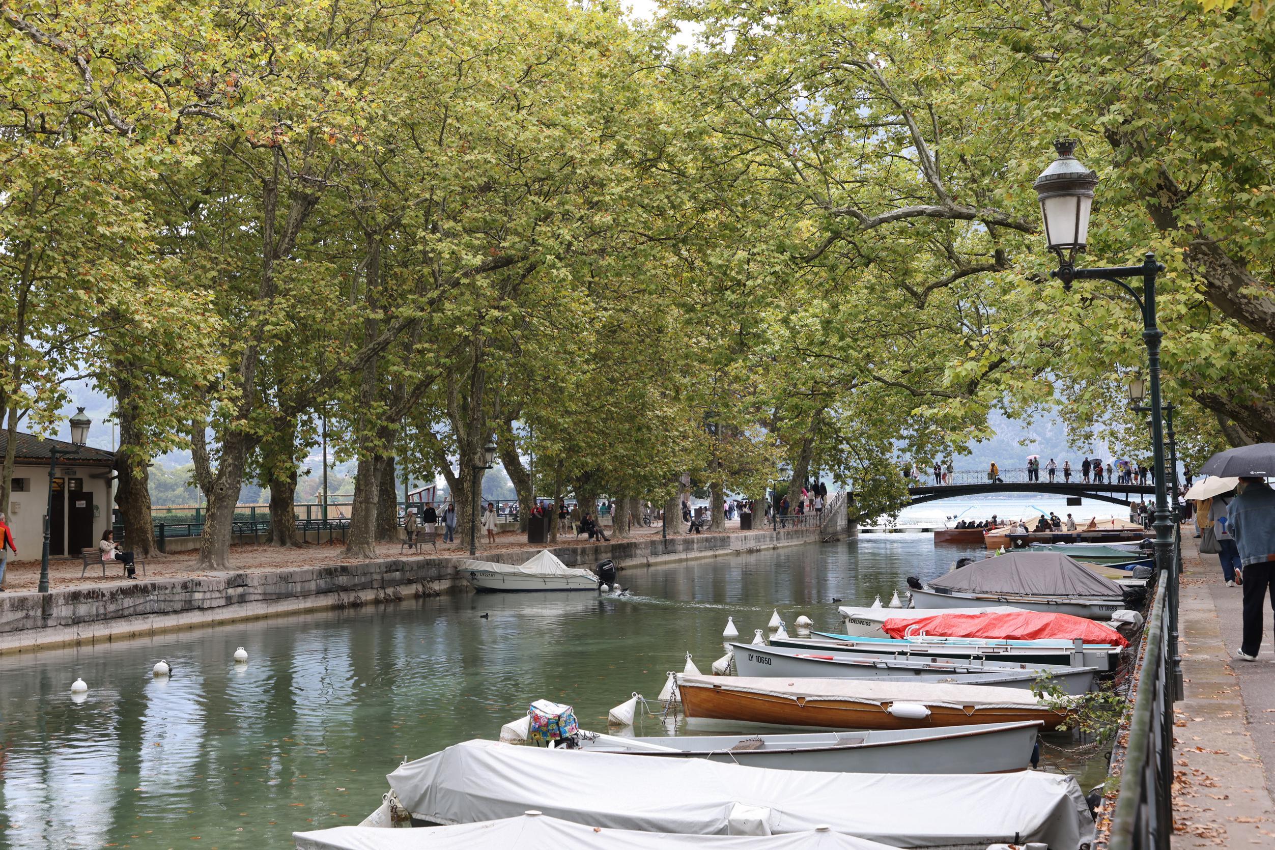 之一 遠岫迤邐接碧霄,煙波萬頃映輕搖, 孤帆數點浮光外,人立湖津聽晚濤。 之二 山色朦朧水色寒,數聲柔櫓過前灘, 晚來收盡瀟湘雨,惟見湖心月半彎。 之三 蒂烏河畔錦玲瓏,奼紫嫣紅煙映空, 穿梭人潮如織錦,尋芳共在畫圖中。 之四 翡翠波光漾翠微,石船孤峙影依迴, 千年古堡河中立,疑是仙蹤入夢飛。 在安錫吃過午餐,微雨中來到安錫湖,走過遍植法國梧桐的瓦瑟運河(Canal du Vasse),再經愛之橋(Pont des Amours),遠眺湖心,雲影沉沉地壓在阿爾卑斯山的山頭,偶而還飄點雨絲,遠方石灰岩山脈迤邐出一道淡青色的墨痕,沒入氤氳的湖光山色中。這被譽為歐洲最清澈湖水,以帶著綠的淡藍色,像土耳其藍(Turquoise),也像蒂芬尼藍(Tiffany Blue)的夢幻水色著稱,此刻褪去了寶石的光澤,在多雲微雨的天色下,泛著一種溫潤而內斂的灰藍。煙波浩渺間,幾抹輕盈的船影如斷章的詩句,隨意點綴在靜謐的湖面。空氣中滲透著微涼的濕意,細雨偶爾在水面勾勒出漣漪,又悄然散去。這份冷調的詩意,天地悄然,唯有遠山與湖水在霧氣中交疊,編織出一場不願醒來的法式初秋之夢。