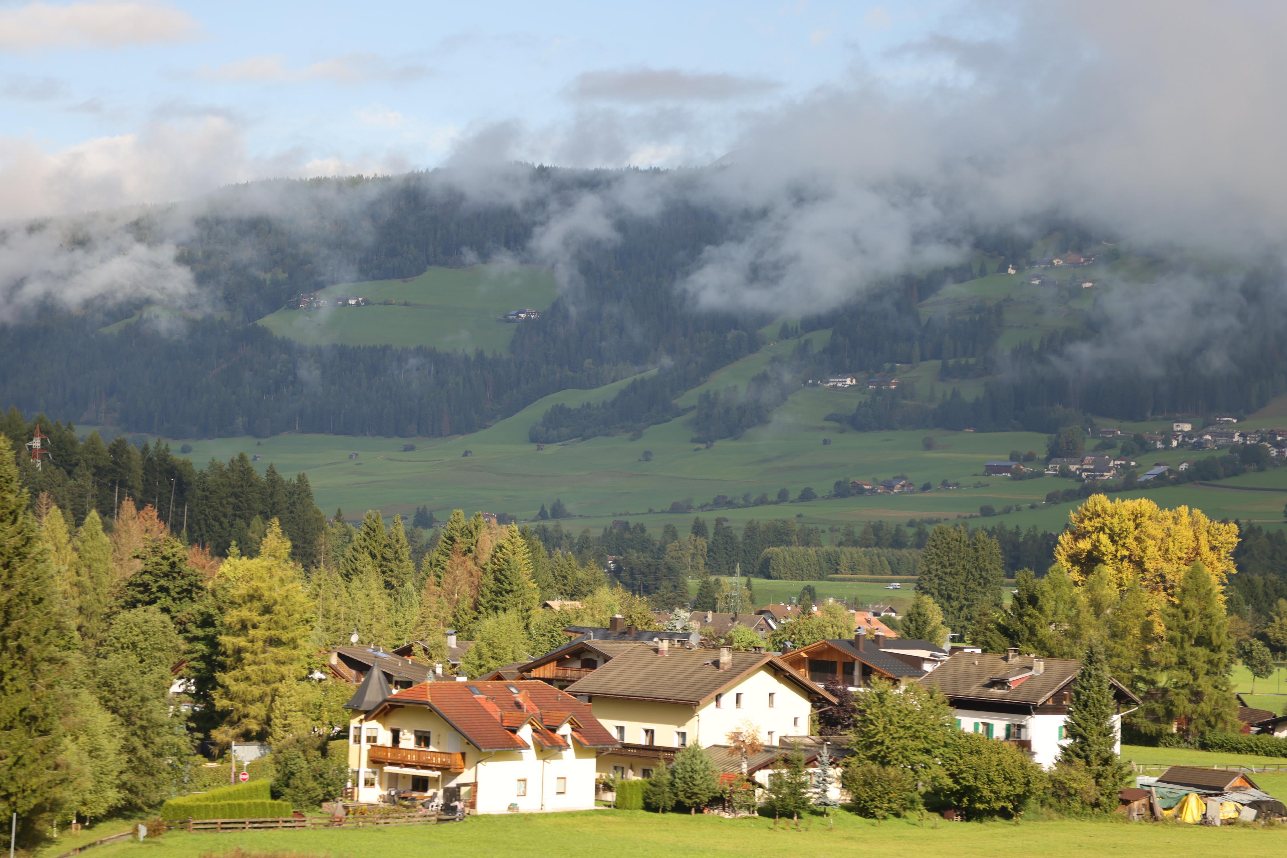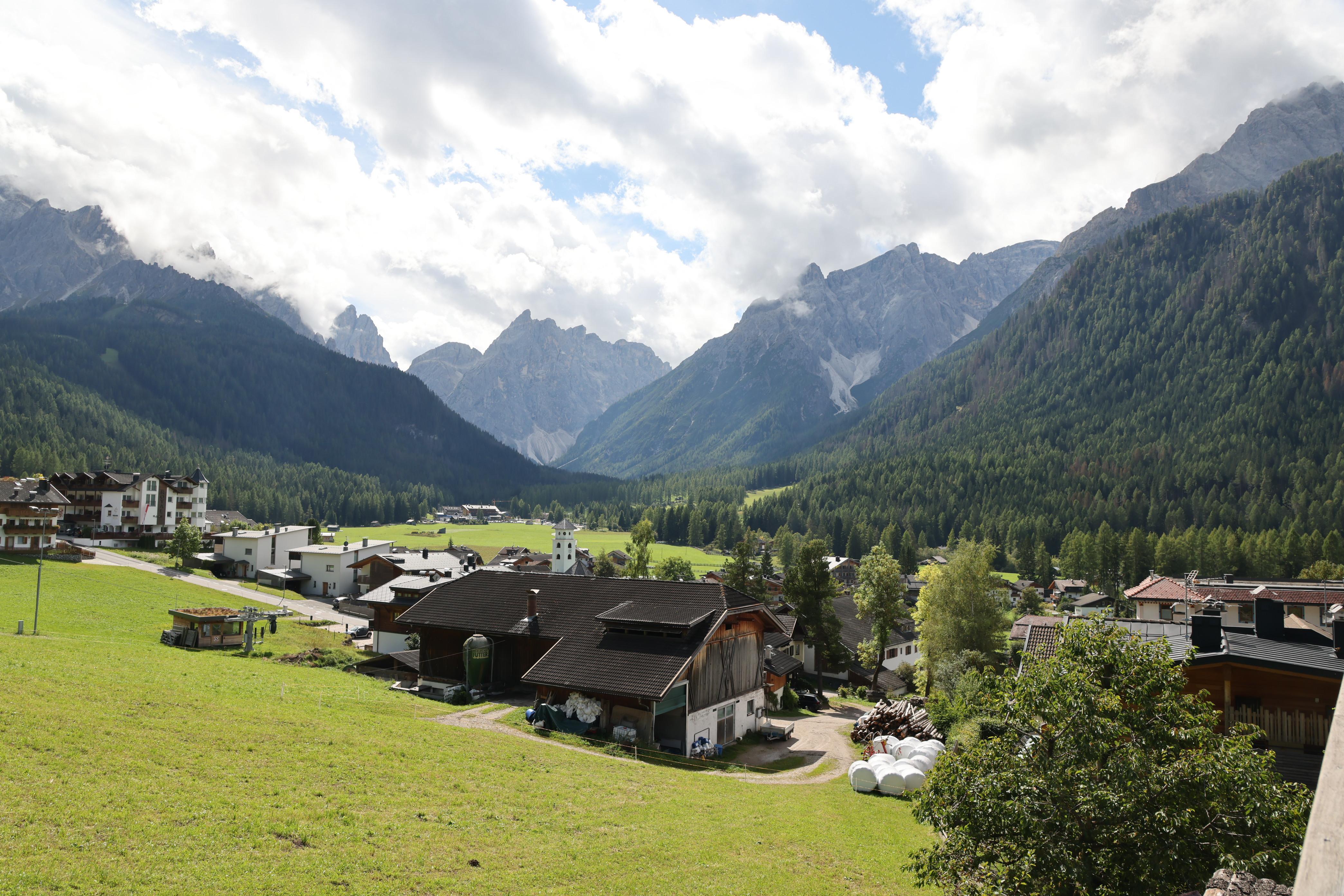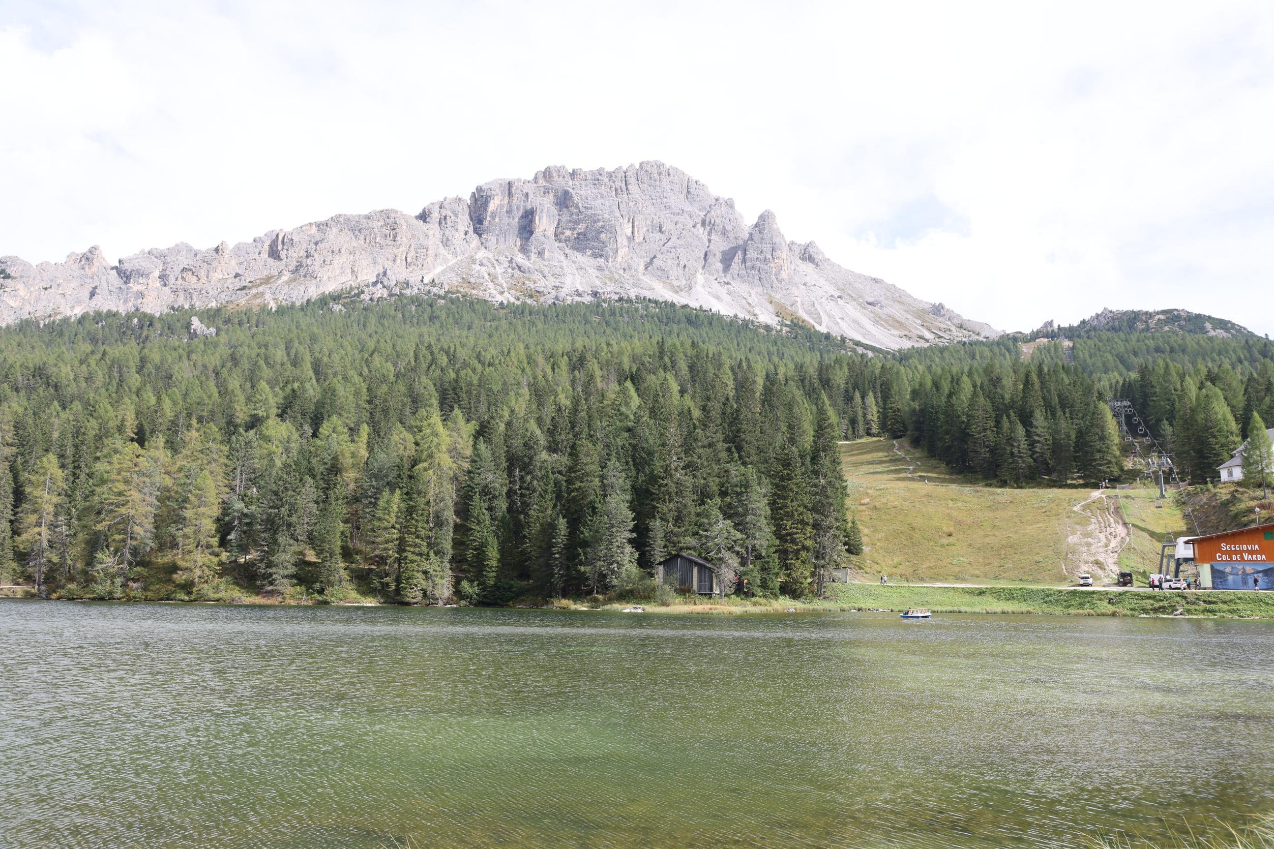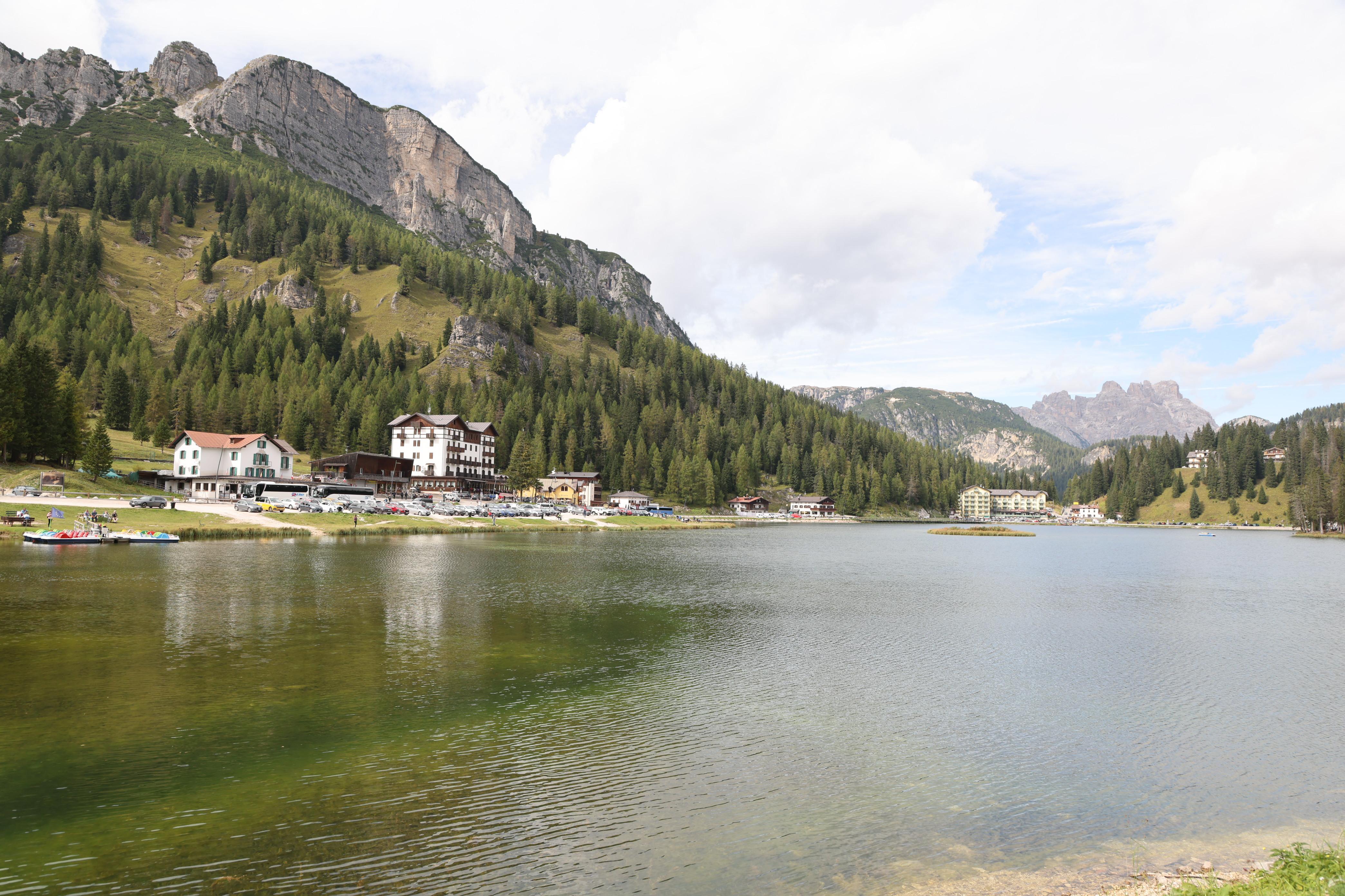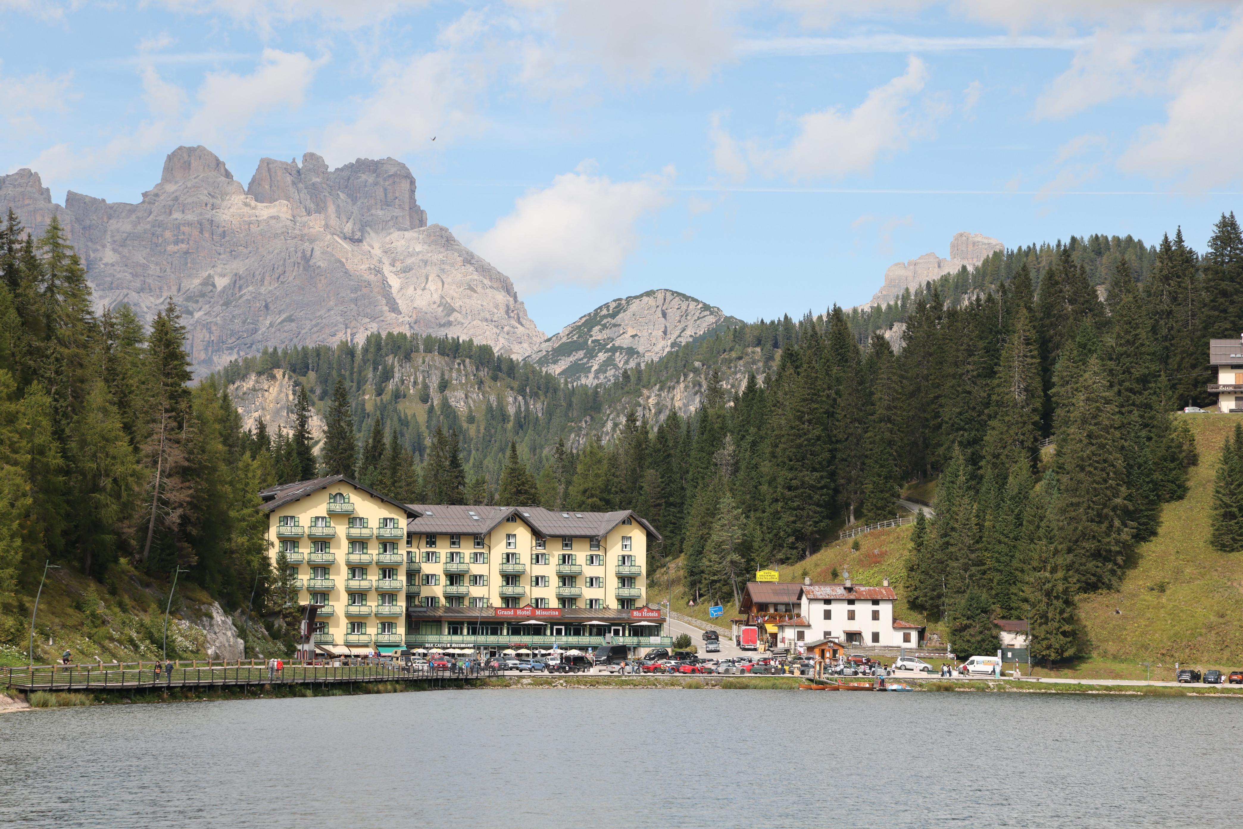 ▲密蘇里納湖的南岸,背景是索拉皮斯山(Sorapiss)群峰,因此地空氣清新,中間建築現在是義大利唯一的兒童氣喘治療中心,由二戰前的密蘇里納大飯店改成。至於舊的密蘇里納大飯店,跟現在湖東北方的密蘇里納大飯店之間有何關連? 則不得而知。(摘自Wikipedia)