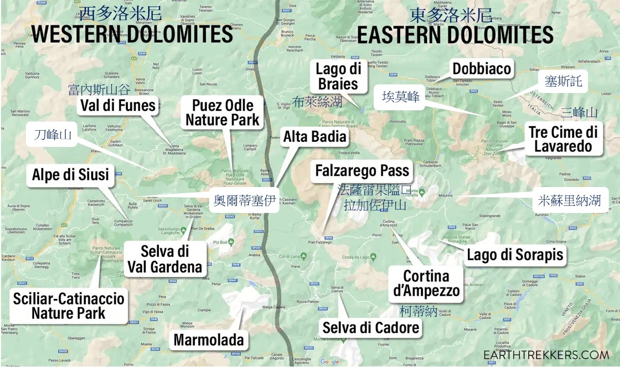 ▲▼多洛米堤一般分東、西兩部,著名景點如這張地圖所示,有翻譯為中文者,是這趟旅遊參訪的景點(上),下圖是埃莫山纜車站所拍的說明圖,由纜車站往南眺望所見的山型 (下)。