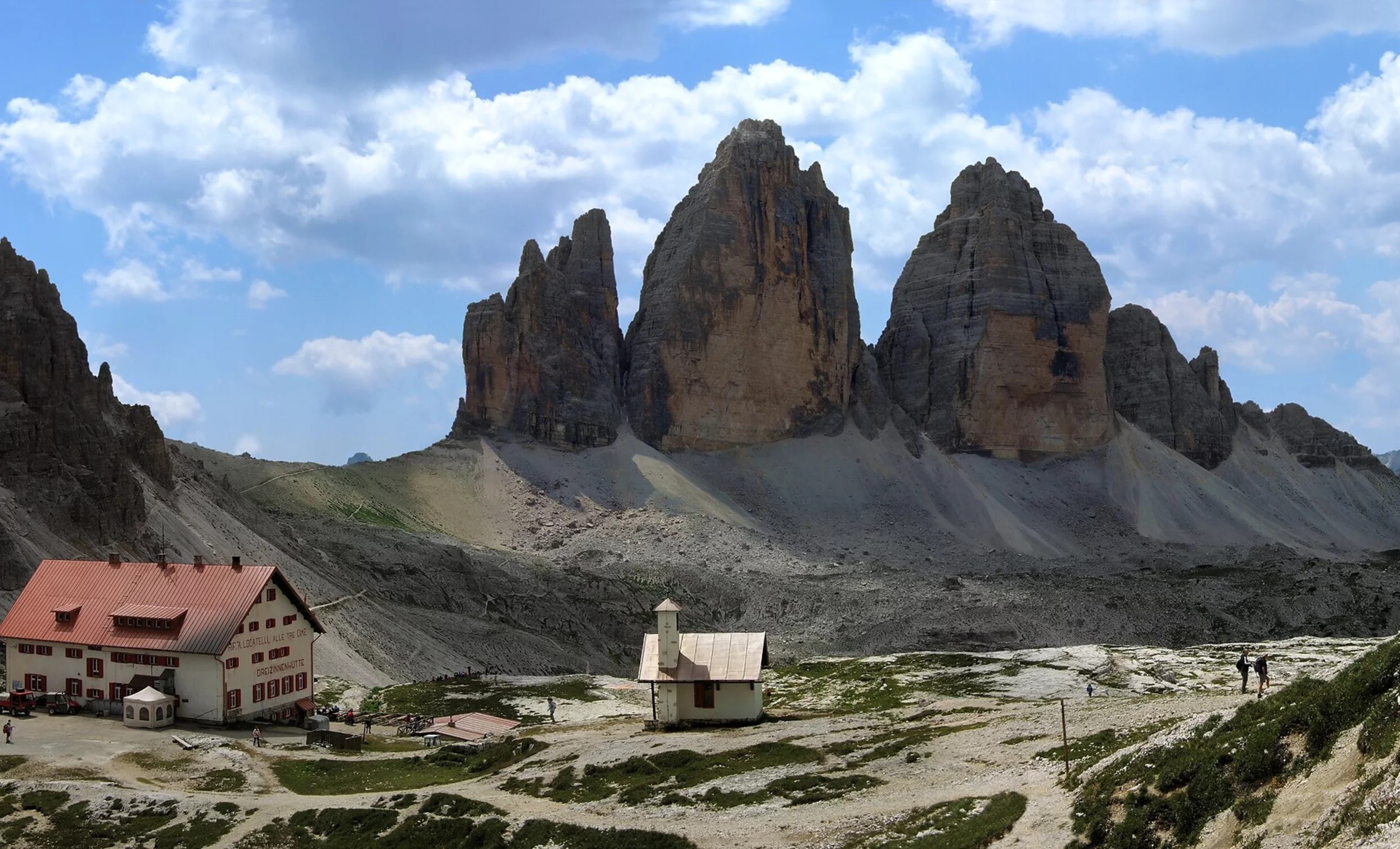 ▲三峰山北面近拍,自左而右,分別是小峰、大峰及西峰,照片左下方是三峰山山屋(Refugio Lavaredo),也稱洛可特立山屋(Locatelli Hut),其右手邊是座小教堂。(摘自Wikipedia)