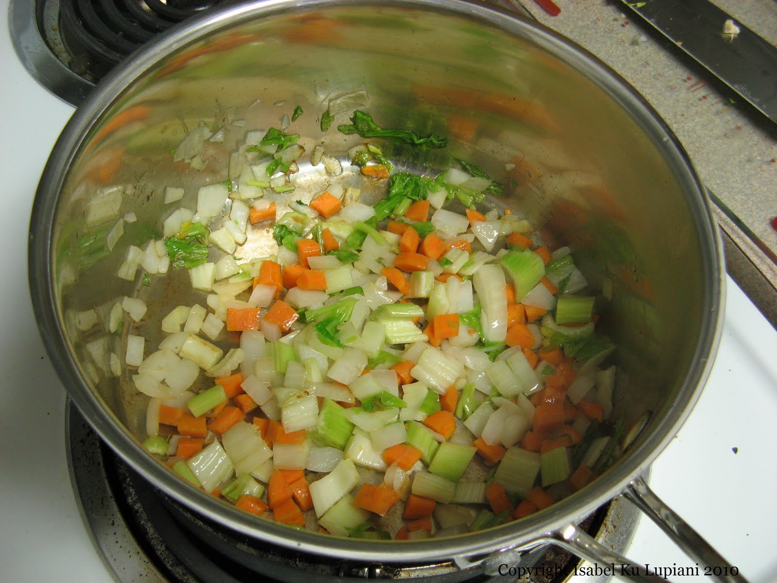 作法: 一大匙奶油中高溫爆香Mirepoix,直到變軟,輕輕焦黃。 添加蘑菇莖,混合,炒3分鐘。 用一點水或白葡萄酒鬆脫刮起鍋底焦黃部份。 鍋離火。新增4 1 / 2杯冷水。 加入月桂葉,乾糙百里香(或