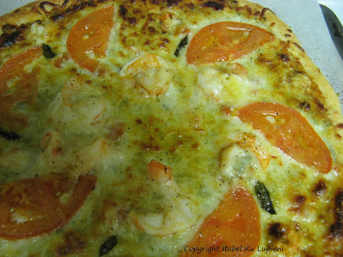 Tags: 比薩, 蝦, 青醬, 起司, 義大利, 羅勒 平常傳統紅醬的比薩吃膩了, 這次換青醬 青醬是用橄欖油, 大蒜, 羅勒, 松子, 帕瑪森乾酪(parmesan cheese)作成的, 跟海鮮很配 食譜來源: Isabel 準備時間: 10 分鐘 煮時間: 20 分鐘 全部份量: 四人份 一人份: 兩片比薩 材料: 自製基礎比薩麵團(或是市售現成的麵團或桿好的比薩餅皮) 事售或自製青醬(pesto), 約四大匙 新鮮蕃茄, 切小丁, 約兩大匙 新鮮蕃茄, 切半圓片, 六片 三, 四尾新鮮大蝦, 去殼去腸泥, 剖半或切塊 莫薩里拉起司(mozzarella cheese), 乾的刨細絲或是新鮮的切小塊, 約半磅(220克) 新鮮羅勒葉, 少許(可省略) 作法: 1. 餅皮除邊邊上(圓周)兩公分以外, 均勻塗上一層青醬. 2. 均勻灑上一層起司. 3. 灑上蕃茄丁. 4. 排上蝦, 蕃茄片, 羅勒葉 5. (此時比薩可以用保鮮膜包好放冰箱晚點再烤, 或放冷凍長期儲藏.) 6. 烤箱預熱到350F(180C). 餅皮邊邊上(圓周)兩公分塗一層油. 比薩可以整個灑或噴上一層橄欖油, 幫助烤到焦黃. 烤20分鐘左右. *一杯 240 ml, 一大匙 15 ml, 一小匙 5 ml. |