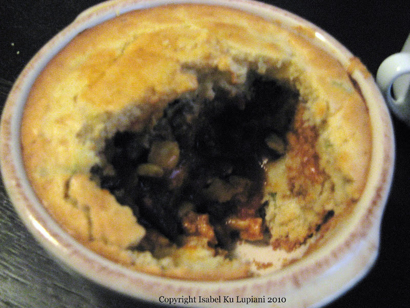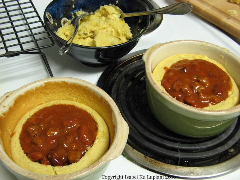 關鍵字 Tags: 玉米, 派, 墨西哥, 肉醬, 牛肉 用香甜美式鄉村風味的玉米瑪芬做為派皮, 內填任何喜歡的罐頭濃湯, 就可以烤出漂亮又好吃的派. 食譜來源: Isabel 準備時間: 10 分鐘 煮時間: 55 分鐘 全部份量: 兩人份 玉米麵包派皮材料: 1杯中筋麵粉(all-purpose flour) 1杯玉米粉(yellow corn meal) 6大匙白糖(或是4大匙代糖+2大匙白糖) 1大匙泡打粉(baking powder) 1/2小匙蘇打粉(baking soda) 1/2小匙鹽 1/2杯低脂酸奶油(light sour cream), 用低脂優格也可以 3大匙植物油或融化奶油 1杯低脂鮮奶 2個蛋 2把冷凍(或是罐頭瀝乾)的玉米粒. 冷凍的可以直接加, 不用解凍. 如果内餡用的是墨西哥肉醬chili: 2大匙切碎的Jalapeno pepper(瓶裝的或新鮮的都可以) 內餡材料: 1罐(16盎司/500克左右)市售的墨西哥肉醬chili, 或是其他任何種類的罐頭濃湯 作法: 1. 準備兩個16盎司的碗/杯狀烤模. 烤模內噴或抹上一層油, 防沾. 2. 烤箱預熱375F/190C. 3. 玉米麵包派皮所有粉類材料混合, 過篩. 4. 玉米麵包派皮所有濕的材料逐一加入2, 混合均勻(此麵糊質地類似瑪芬麵糊, 勿過度攪拌, 以免成品過硬). 5. 將每個烤模注入麵糊至模子內一半高度. 送入烤箱, 烤23分鐘. 6. 烤模取出. 烤箱溫度調高至至400F/200C為下一步做準備. 用湯匙把玉米麵包中間挖出, 形成一個碗狀. 將罐頭濃湯用湯匙填入每個"玉米麵包碗"中, 至滿. 再將剩下的玉米麵包麵糊分半, 輕輕倒到每個烤模裡. 用湯匙將麵糊上面抹平, 盡量把所有的濃湯封住. 7. 送入烤箱烤約23分鐘. 烤模取出, 放涼10分鐘. 完成! *一杯 = 240ml = 8oz *一大匙 15 ml, 一小匙 5 ml. |