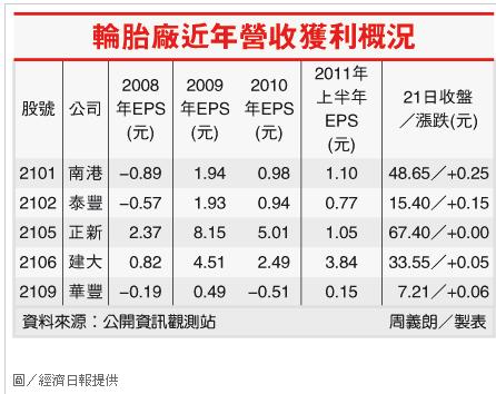 南港上周五股價收48.65元,上漲0.25元;泰豐股價收15.4元,上漲0.15元;正新股價收在67.4元,以平盤做收;建大則收在33.55元,上漲0.05元。