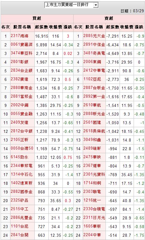 上市主力進出排行榜(時間 101-03-29
