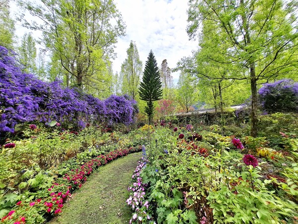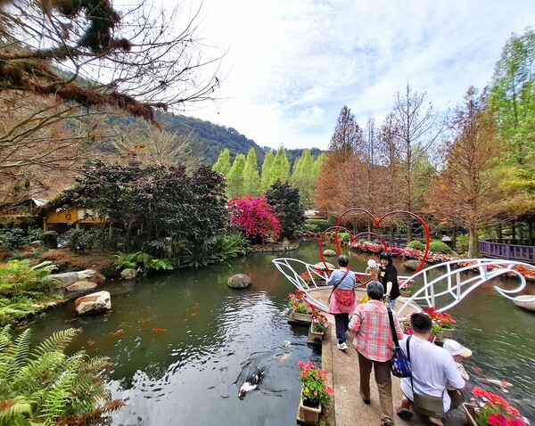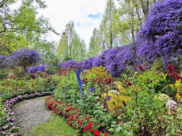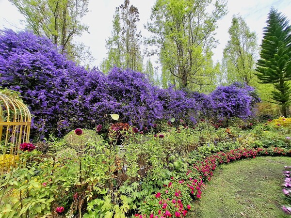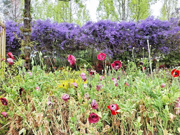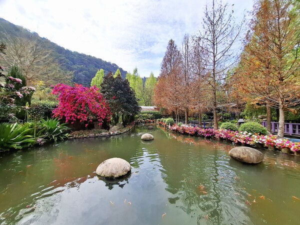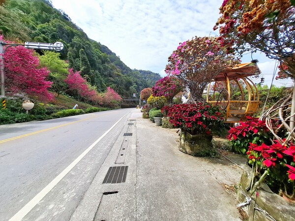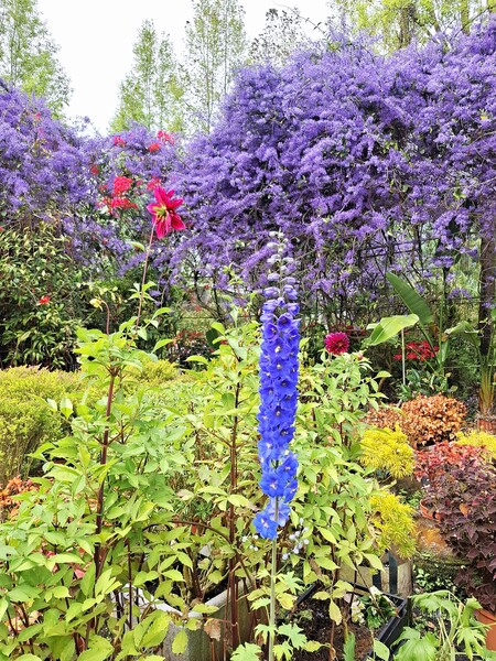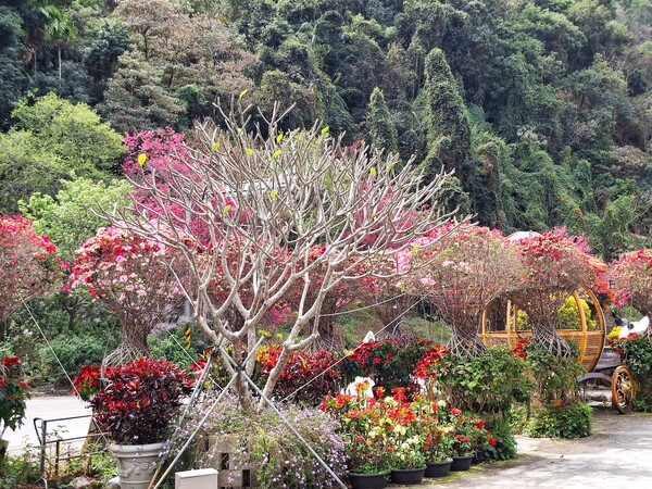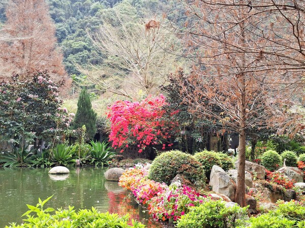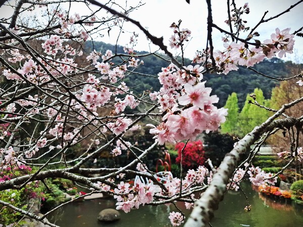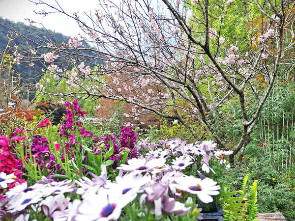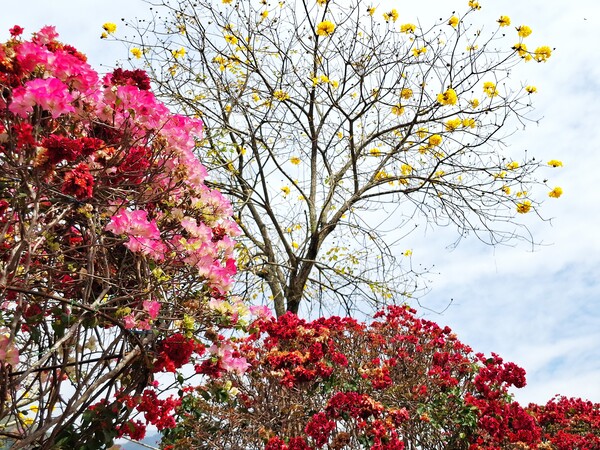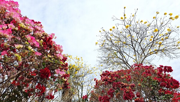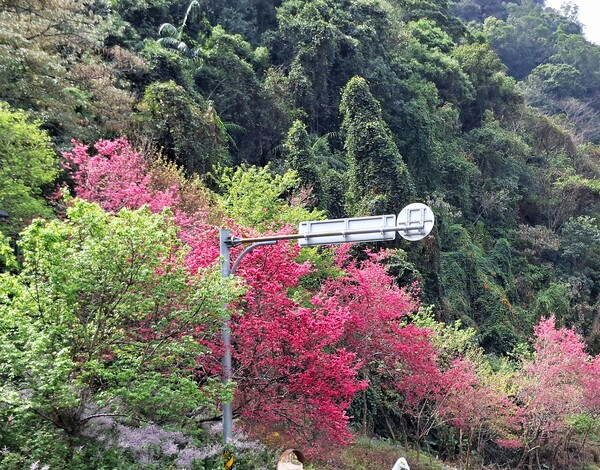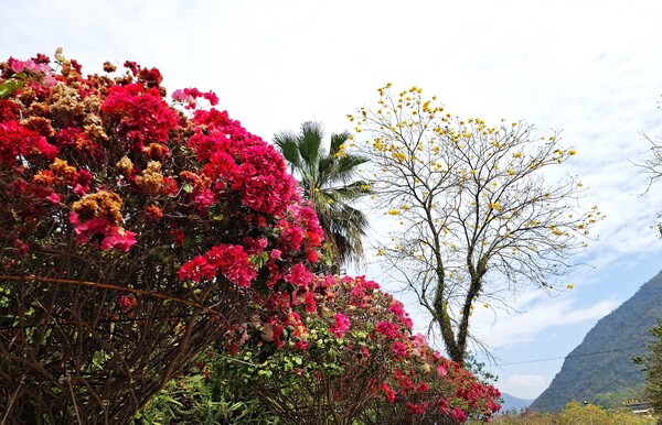 粉櫻幾株山如畫,重葛奪目十丈紅。