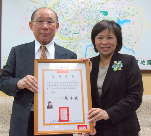 記者陳永順/嘉義報導 中央選舉委員會委員紀鎮南17日代表到嘉義市,頒贈當選 第8屆嘉義市長就職典禮,12月20上午10時在嘉義市文化局 中央選委會12月11日公告各縣市長、縣市議員當選人名單 黃敏惠表示,4年前因事沒有當面接到中選會的當選證書, 黃敏惠指出,嘉義市明年將主辦2010年台灣燈會,中山路 |