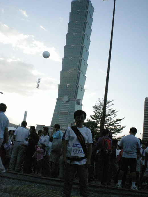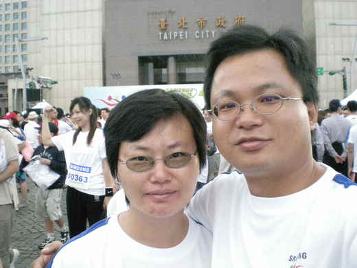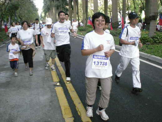今兒個起了個大早,真的很早,3:50吧!為了趕著在六點左右到達台北市政府廣場參加2008SAMAUNG舉辦的路跑活動. 5:00由平鎮出發時,天還昏暗著,外頭有點涼意.五點五十五左右到達會場,天已經亮了.太陽一出來,寒意其實已經消了一大半.但真正讓人不覺寒意的是現場的人山人海,這熱情參與的群眾不乏全家動員的,也有年青朋友互相邀約的,更有團體報名被遊覽車載著來的.光是受理報名的報名區就排了將近十條的人龍,每條人龍少說一百公尺長吧.主持群估計現場參加活動的應該有三萬人,真可謂盛況空前呀! 換過大會發的衣服,7點左右,舞群老師領隊做暖身操,大家賣力活動筋骨,蓄勢待發. 隨後,倒數鳴槍,乍時現場萬人鑽動,雖名為路跑,其實大家幾乎是一個捱一個向前走.現場還有小朋友打趣的說:我覺得我們這是在遊行吧!朋友以為我跑們了多遠?從市府廣場出發,向前跑到安和路再折返,全長不過3km.而且,因為人數眾多,整體跑步速度根本是很慢的,有流汗,一點點喘,回到廣場後一群人又排起了人龍領取紀念品~環保筷一雙. 會後的抽獎穿插在眾多的表演節目當中,不少人老早放棄抽獎,離開了市府廣場.有的趕赴下一個活動現場;有的回家補眠;更多的是三三兩兩席地而坐,享受封街後可以自由橫臥在大馬路上的快感.我們也閒不下來,跑到另一側的人工沙灘摸沙子.這個曾經喧騰一時的信義區沙灘,跟我想像的有些不同,沙子的顆粒很粗,不太像我在鄉下可以踩踏觸摸的.不過,相信這獨特的觸感與沙灘的感覺已經足以滿足生活在都會區的台北孩子. 今天的活動最最可惜的地方在於,咱的孩子沒有跟,因為太早了,他們根本起不來,只好放棄.經過今天現場的萬人洗禮之後,我想,下次,無論如何,一定要帶著孩子一起來,感受大型活動的魅力,也感受~健康,真好.
