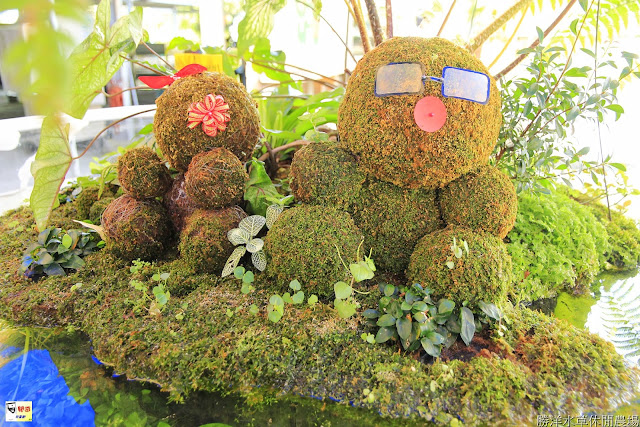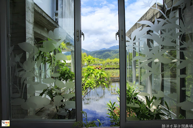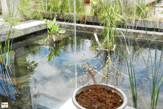 水草行光合作用正冒著泡泡呢 館內陳列有手繪圖書、手作展示櫃等設施,用以傳達出「水草」與人類生活食衣住行等面向的緊密關係,並介紹國內常見水草種類,包括藥用水草、食用水草、觀賞用水草……,以及各種水草相關商品,是認識水草生態的最佳選擇。![]() 從玻璃屋往外看,藍色白雲,而池中的水草因水倒映讓水池更是翠綠,雖然水草館沒有冷氣,微風吹拂倒也不會覺得熱