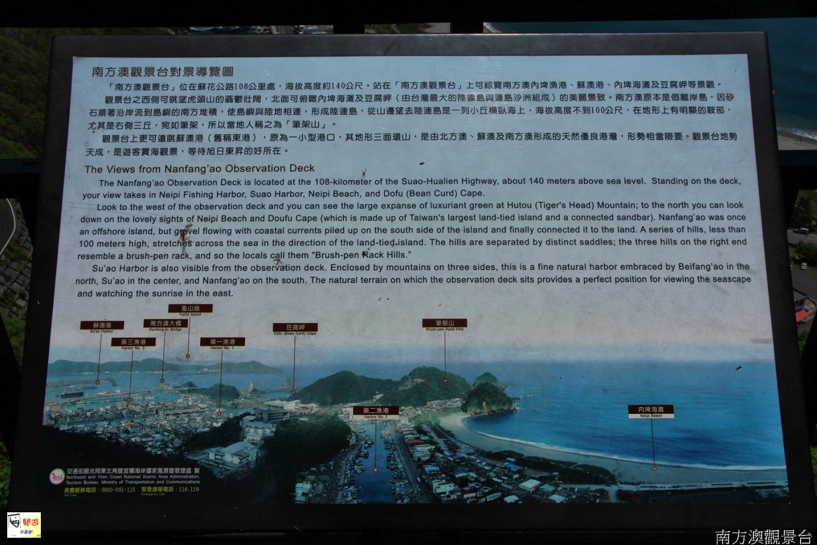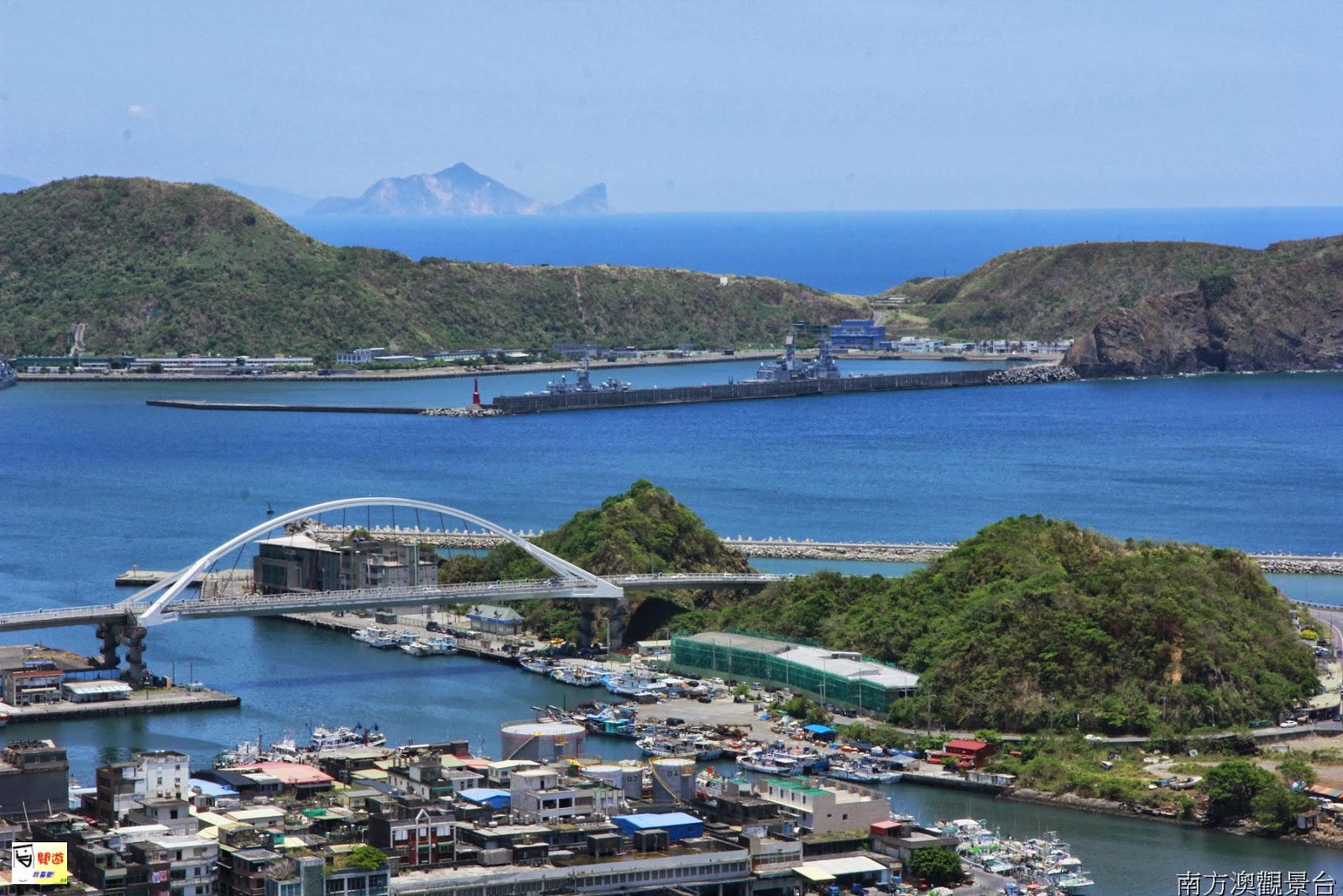 這處標高約 觀覽南方澳漁港全景、弧形的內埤海灘,以及猶如筆架般、也像一位孕婦橫躺海上的筆架山等盡收眼底。綜覽宜蘭無敵美景, 遠眺右方是蘇澳港,蘇澳港舊稱為「東港」, 原為一小型港口,其地形三面環山,是由北方澳、蘇澳及南方澳形成的天然優良港灣,形勢相當險要。南方澳大橋是一座跨越蘇澳港與南方澳漁港的大橋,為亞洲第二座單摃拱型鋼橋,其設計形狀簡潔俐落,相當具現代感,由地方甄選出的菜籃單握把式造型。