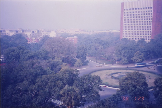 相片1住在Parliament House(國會大廈)旁(Ashoka H.??不太記得了,好像是吧!),夜裡可見為慶祝國慶Rashtrapati Bhawan上佈置的燈飾。 相片2新德里的大路Janpath的路上,可見當時車輛行人稀少,如今則車水馬龍整日川流不息。 相片3國會大廈旁的路樹上禿鷹無數,可見當時德里定有許多動物死屍,才會招惹來群體禿鷹進住,如今這些鳥類在此城中皆已飛走消聲匿跡了。