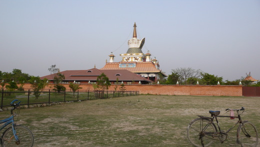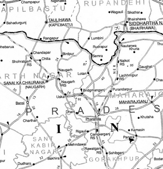 吃早餐時犯了個忌諱,今天我倆因要趕遠路,很早就到餐廳報到,看飯菜已就緒,於是拿著餐盤盛好飯菜,到餐桌上吃將起來,尼人管理員進來,告訴我們說要等出家師父上完早課後才能開動,這是規矩,我們因「不知」也只有靦著顏「不罪」的吃著,用完餐洗好碗盤歸好位「註:這裡一切皆採自助式」,添了些香油錢,去寢室拿著背包就要和韓國寺說再見了!倫比尼再見了! 正走出大門有一韓國僧人問我們要不要搭便車,他們包一吉普車正要回加德滿都,真求之不得,否則我們還得背著大背包走到大門等公車呢!一把老骨頭因之省了點罪受,此時一旁有一老尼問我等意欲何往?回曰「去Piprawa」,其說「印度的Kapilavastu--Piprawa離此很近,只有 照片1由Birdpur到Lumbini現在為一很好走的筆直大道僅有25公里,只是路上沒有關卡,出入境可能成問題耳!
