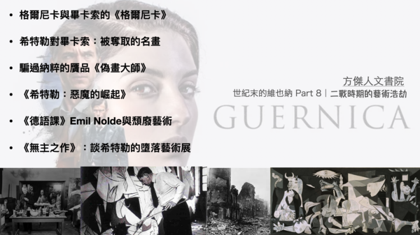 完結篇的內容由幾個主題組成,它比較像一篇篇圍繞着二戰的藝術故事,我們在上學期討論畢卡索的《格爾尼卡》、騙過戈林的偽畫大師米格蘭、希特勒的崛起、表現主藝畫家Emil Nolde的故事、納粹的《頹廢藝術展》。