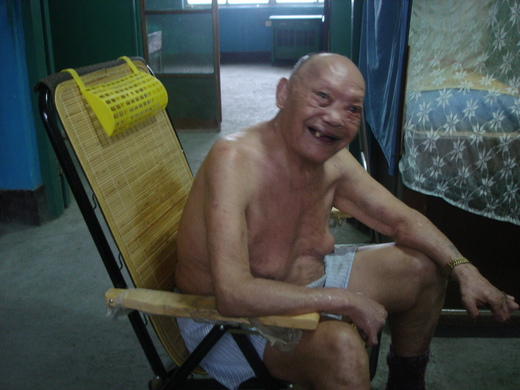 圖說:夏天熱,總是打著赤膊的爽朗鮑爺爺,見到人總是微笑。 九月十二日,颱風來臨之前,與自己的約定,我終於出發了,在暴雨到來之前,趁著天光,去探望去年迄今許久未見的鮑爺爺,「周小美,妳好久沒有來了。」他笑,我也笑,一起聊聊。 去年九月十二日,樂生經歷了一場激烈的抗爭,經過三百六十五天之後,一切都已經恢復了平靜,天氣並不好,不斷飄著陣陣毛毛雨,在中秋節前,樂生療養院新任院長在中山堂設宴款待舊院區的院民們,鮑爺爺告訴我,他眼睛看不到,手也不方便拿筷子,跟別人在一起吃飯不好看,所以不想去。 「沒關係,那我們一起聊聊。」我對鮑爺爺說,順便話家常,沒想到一旁的阿英姊卻不斷插話,起初感覺她有點囉唆,後來卻有意外的收穫,短暫的拜訪,串連起好幾個月的想念,鮑爺爺身體健康,別來無恙,只是膝蓋開始有點風濕,會痛。 不知怎麼地,樂生院總有一種神奇的力量,總是在這裡找到重新呼吸的力量,還有,一種意外發現阿英姊可愛一面的驚奇。