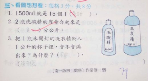 3.把一瓶未開封的洗衣精倒入1公升的杯子哩,會不會滿出來?為什麼?( 不會 ),( 沒有開 )