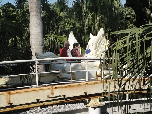 在空中軌道上緩緩前進,居高臨下,俯瞰園區。 飛天魔毯 在2樓,看起來驚嚇指數不高,我們也來玩。 飛天魔毯是以左右平行方式上升。 我覺得很像盪鞦韆盪很高很高的感覺, 升到高點,我們和阿拉伯皇宮的屋頂一樣高喲! 阿拉丁和神燈出現囉! 擦擦神燈,神燈巨人也會幫忙實現願望嗎? 可愛的非洲土著造型立偶, 這是......廁所指標,太可愛了! 園區裡隨處可見可愛吉祥物造景。 我們遊玩的時節是11月初,接近萬聖節, 園區內有很多萬聖節的佈置,歡樂又可愛。 大漢堡,咬一口。 美國大西部的笑傲飛鷹 直聳入雲霄,光看就害怕, 我們還是在地面上聽聽上面勇士群的尖叫, 向他們致上膽量滿點的敬意就好。 荒野雙鏢客, 這種溫和的項目比較適合我們家。