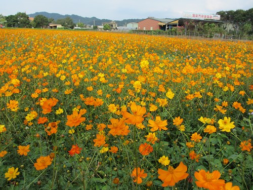 老街中還有許多傳統粿的小攤。 這家麻粩在現場製作喔! 逛完老街,沿著充滿綠意的坡道走回停車場。 路邊的護攔,裝飾了色彩鮮豔的陀螺。 在停車場旁看見一大片波斯菊田。 旅途裡意外的風景。