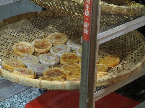 這母女倆眼光相同,喜歡同一款提袋,哈哈!還一人買一個。 大溪和平老街 午餐過後,驅車往大溪老街;熱鬧的大溪和平老街,精雕細緻的歷史建築、小吃美食,遊客滿滿,一起來邊吃邊玩。 巴洛克風格的華麗建築,傳訴曾有的風華歲月。 陳媽媽月光餅,看起來不錯吃的樣子,我們也進去瞧瞧。 櫥窗裡有模型樣品, 有3種口味:地瓜、芋頭、抹茶,1片$15元。 包裝有3種,依個人的需求選擇。 原來,月光餅是大溪人的中秋月餅呀! 月光餅要經過22道工法才能完成。 費工的月光餅,只好限量供應。 現場製作月光餅。 出爐的月光餅放在竹篩上散熱。