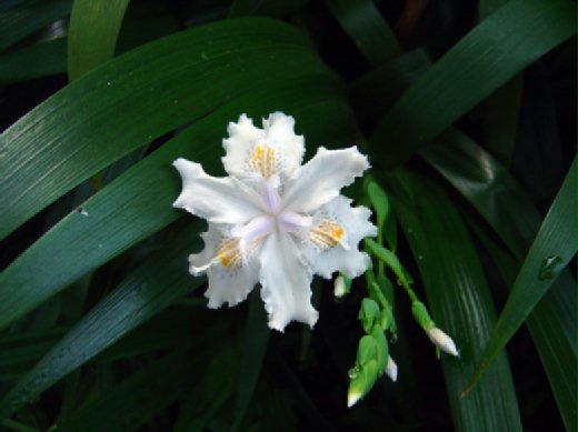在溪頭散步時拍的,白色鳶尾花,盛開在清晨朦朧的微光中,一時心動就按下快門了,但是手上的SONY P-10雖然跟我三四年,可是我還是不懂它的使用方式,拍回來時曝光不足,整體顯得陰暗,所以用軟體重新調整過曝光效果。
