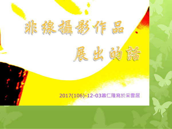 在民國106年4月 4 日起推出全景攝影展後,至今已到年底。這次將我從民國101年發現非線攝影的手法後;至今所拍攝的非線攝影作品數千張中做了篩選,找出具有指標意義的作品展出。這是自從發現非線攝影手法及發表相關論文後,首次有系統的展覽除全景攝影以外的非線攝影作品,觀看者可以從這些作品中和傳統攝影做比較,我深信都會發出驚嘆:攝影也可以這樣拍,我怎沒想過!其實,這都要拜數位攝影技術的日新月異,從模仿繪畫技術開始,到可以色彩分離技術的成熟,於是在光與影的變化中,產生千變萬化的影像作品,化夢幻為可能。(2017-12-03蕭仁隆於采雲居) 【後注】由於部分圖檔畫素過大,無法上傳,完整展覽請觀看所附註的youtu.be網址,共分成兩部影片播放。 影片網址: