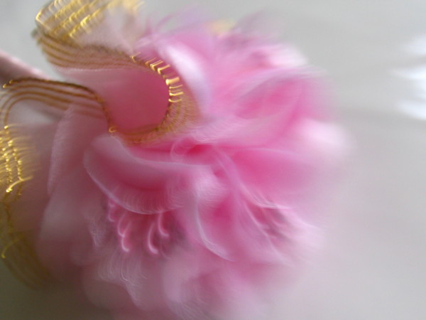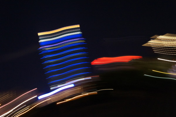 「交融」(圖4) 接下來圖5圖10共六幅作品,是以攝影者靜態與被攝影者動態的攝影手法攝得的作品,但有時加入以相機前後快拉或快速轉換變焦鏡頭等方式獵影,產生了比前面四幅作品更為抽象的作品。作品欣賞說明如下: 「台北101大樓變形系列」(圖5),這是以台北101大樓為場景所作的非線攝影手法。在相機的動態變化攝影下,台北101大樓已經不再是一棟高聳的大樓,而是讓人驚豔的抽象作品。這幅作品以大樓的腰部為取景,一片一片的窗戶化成彩色的稿紙在天空飛揚,彩帶亦隨之而飛升。如此的變形手法是非線攝影所企求的一種成像方式。「獵影」(圖6),則是運用相機變焦鏡頭快拉造成的結果,也是傳統攝影常用的手法,失敗率甚高品,本來不甚特別的作品,變成聚焦性動態美感的作品。「玫瑰之夢系列」(圖7),則以捧花為攝影主體,運用不同角度的拍攝及取景,配合光圈與速度的變化,建構心中的圖本。該作品在光影與搖晃間產生似花非花的夢幻感,有的玫瑰幻化為飛奔的精靈,有的成為如雲霧般的紫色,於是釀造成為一種夢幻。「流動的文本」(圖8),同屬〈台北101大樓變形系列〉之一,但卻幻化為一層層飛奔的文本,而非線文本豈不是一個多層次的不斷變化的可以流動的文本?這幅作品正好可以正確的詮釋文本的流動性。「蘭嶼獨木舟變形系列」(圖9),蘭嶼獨木舟本身就相當豔麗,經過非線攝影手法後,猶如從夢幻的幽洞中竄出的幽靈船,扭曲的船身凸顯出正在變化之中的樣貌。「粉紅之夢」(圖10),人們心中都有一個粉紅的夢想,這幅作品以逐漸晃動的粉紅花朵來彰顯心中的粉紅夢想的悸動,在左上角的黃金絲帶象徵這個夢想可能的結局。