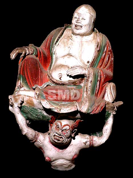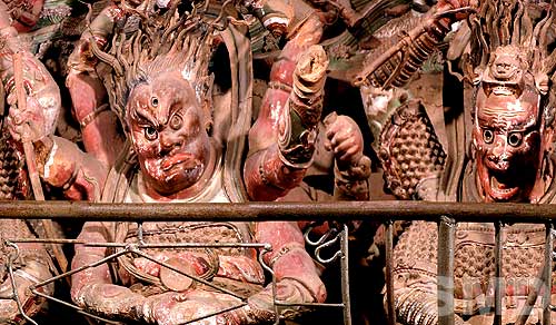 巨幅圖片 佛國盛世局部 水陸庵,位於藍田縣東約10公里的王順山腳下,以保存古代精巧罕見的彩塑而聞名,被譽為“中國的第二個敦煌”。 當地群眾以“三石六鬥菜籽”來形容水陸庵壁塑數量之多。這裏最精彩的是大殿內的彩色泥塑,相傳出自于唐代著名雕塑家楊惠之親手。 琳琅滿目的泥質彩塑由唐代尉遲敬德監修,佈局上強調“滿”字,突出“多”字,在牆體和樑柱上共嵌有3700多尊人物造像,主尊釋迦牟尼造像高達5.63米,最小的僅有5公分大,形成一幅栩栩如生的立體佛國盛世圖。 我曾專業製作全景照片和巨幅照片的,很多巨幅摩崖石刻和大型牆壁雕塑在我的鏡頭下生輝。但是面對如此大到巨人,小到掌心,細膩精巧的立體牆壁雕塑群,要在如此狹小的拍攝空間裏將其完美的展現出來,一時間竟然無從下手。 對研究佛教藝術文化,以及3D造型設計,CG藝術設計的朋友,這些具有很高的藝術欣賞和收藏價值. 下圖 五百羅漢過海特寫