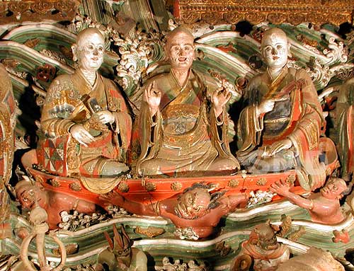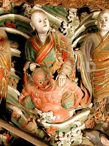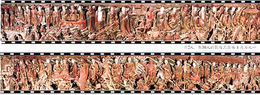 上圖 五百羅漢過海180度巨幅圖片全貌 水陸庵的巨幅群雕“五百羅漢過海”,橫貫南北山牆,在一幅精心設計的大海中,一批華服盛裝的羅漢自由自在航行,其人物造型,或超然飄逸秀骨清風,真正達到了“穹神盡變”和“通體傳神”的藝術境地。 水陸庵是一個神奇的地方. 在“五百羅漢”這個數字概念上,它並不是平鋪的羅列五百個羅漢的形象,而是在南北牆上,對稱的雕塑了二十五個羅漢的主體群。按照佛教的方位倍數,二十五的二十倍就是五百。在造型設計上,羅漢或從山上,或在河流中,或在寺院中,或在路上,都在集結加入渡海的行列中,從而構成了一幅行進中的五百羅漢隊伍。 這兩組泥塑彩繪巨幅群雕精彩絕倫,人物集中,遍佈在長約20多米的牆上,正面拍攝空間十分狹小,當時的拍攝難度很大,我實驗了幾組方案才搞定。回來後,觀看拍攝的圖片,很滿意,噴繪後的高清晰度巨幅圖片可以到長8米,寬1.2米不失真,具有很高的藝術收藏和研究價值。 次此,能用巨幅全景數碼技術來展現這一精彩場景,也是我的一大榮幸。 下圖五百羅漢過海180度巨幅圖片局部特寫