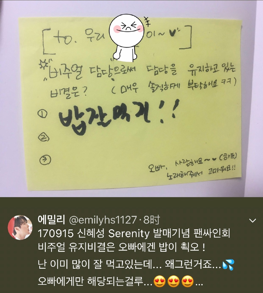 圖2 fan問他作為外貌擔當,維持擔當的秘訣是啥?請他非常坦率地寫。申歌手寫好好吃飯
