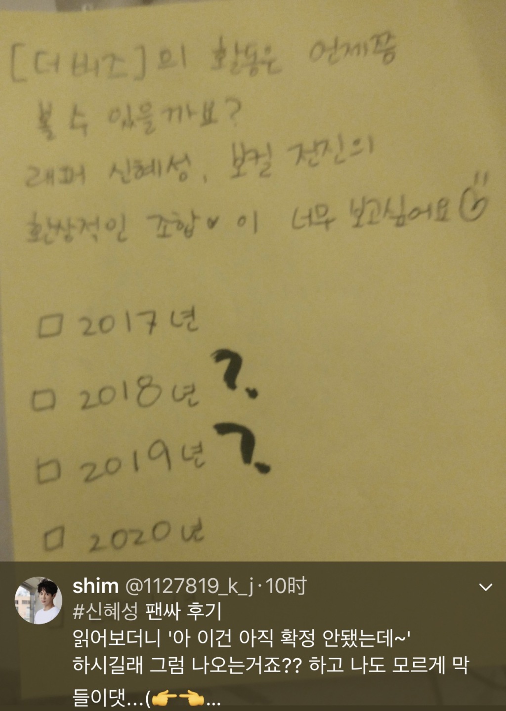 申歌手在2018年和2019年打了兩個問號,簽的時候申歌手讀完問題說這事還沒法定啊,fan問會出來活動吧?申歌手就很有愛地說要不打勾的兩個年份推進下?