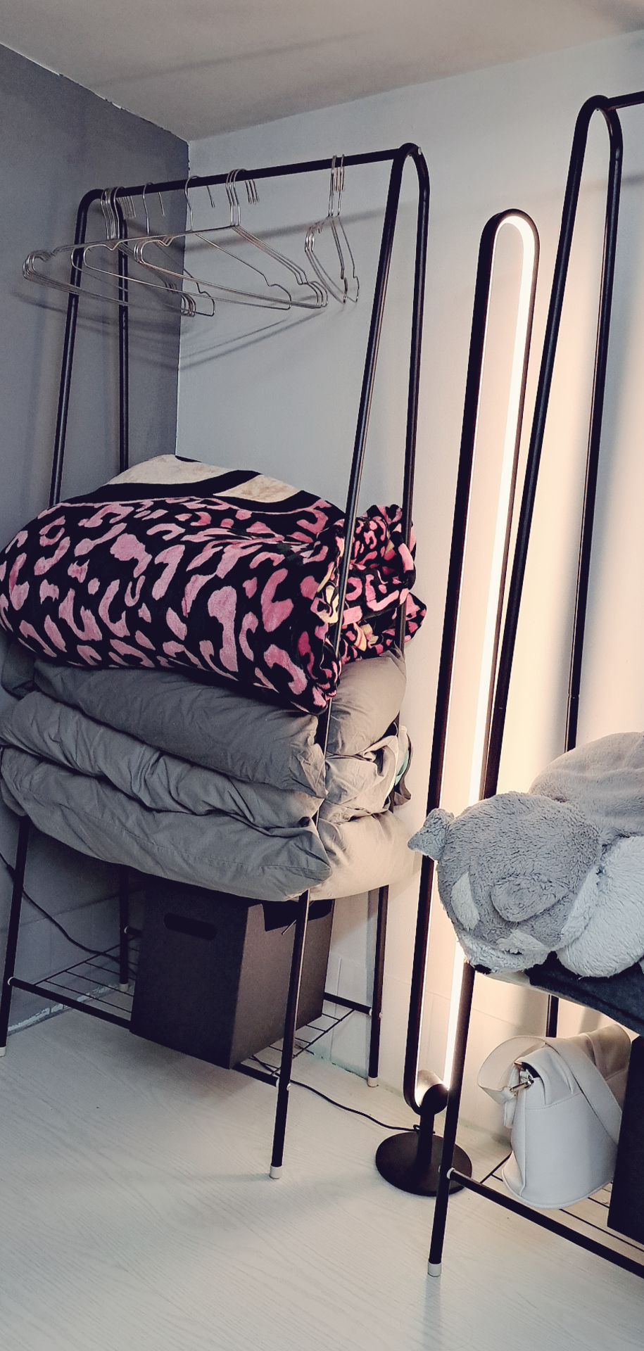 自己買來組裝的衣架。我另外有一間試衣間。 這只是用來掛睡衣和放換洗的床組。